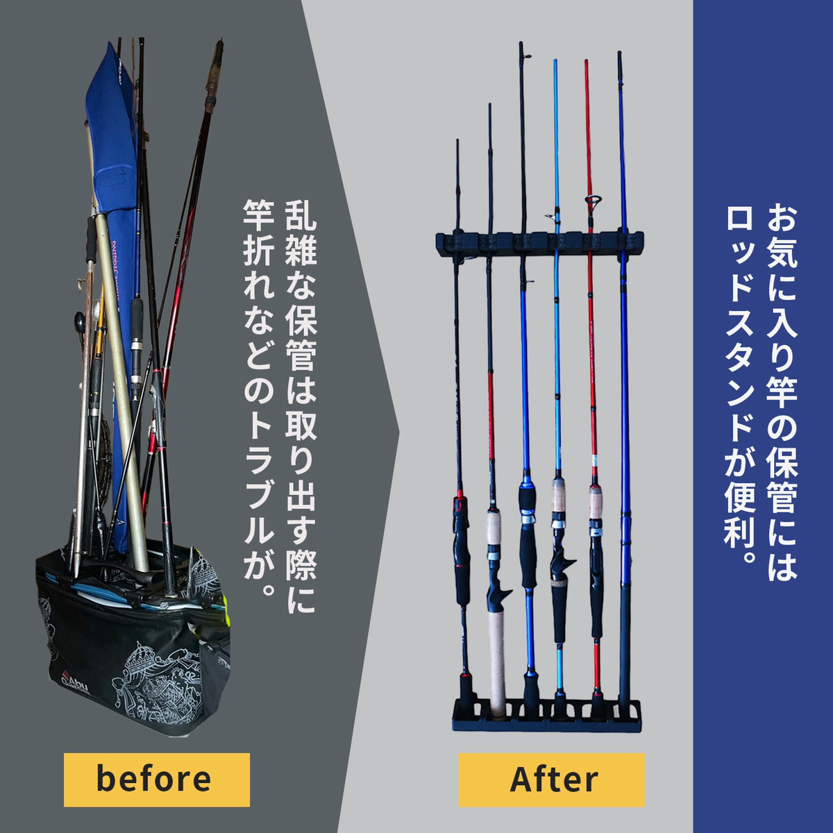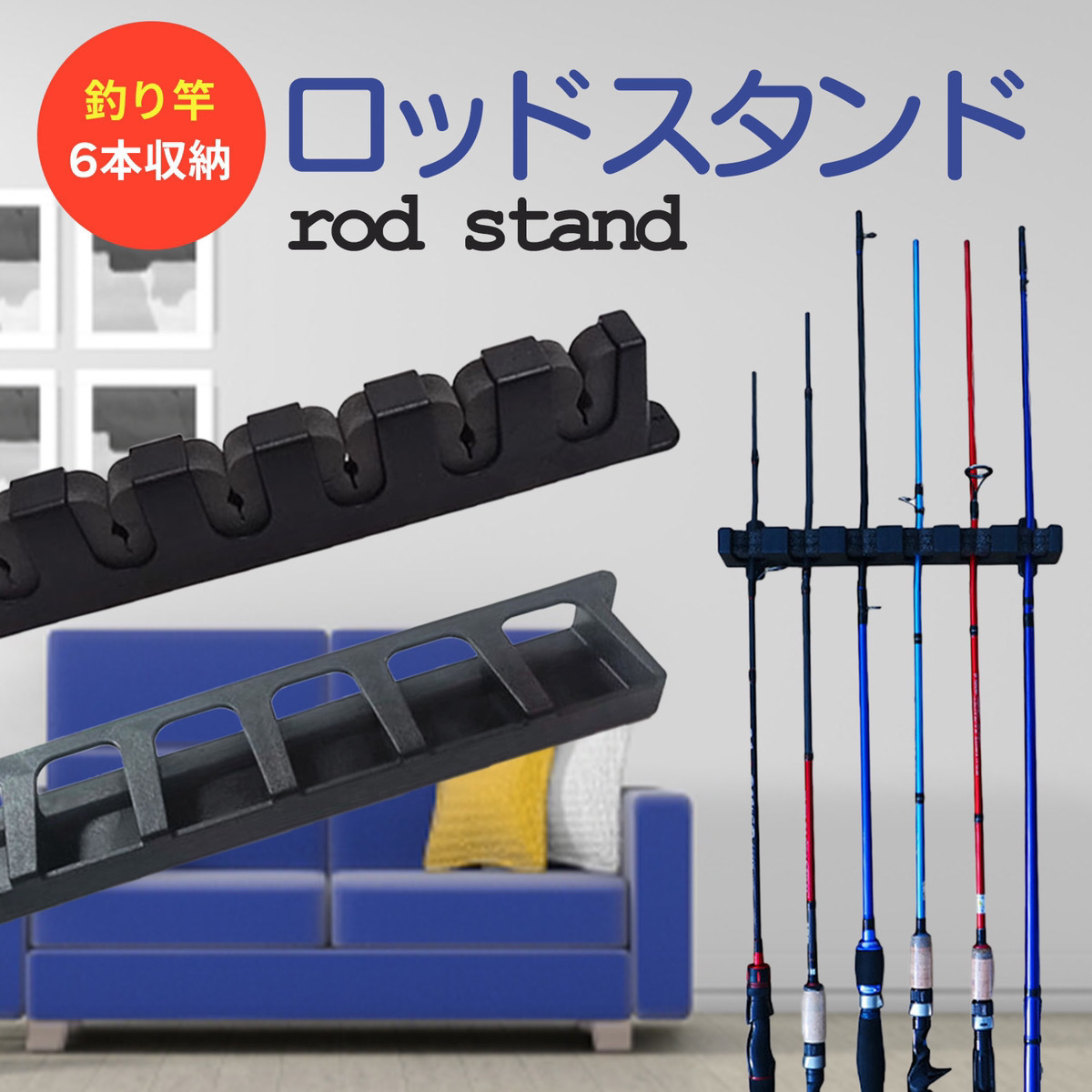ロッド スタンド 釣り竿 ラック ロッドホルダー 収納 クリップ 釣竿 ディスプレイ 壁掛け 省スペース 横置き 黒 ブラック 6本