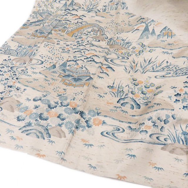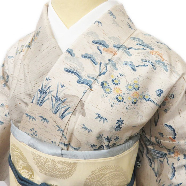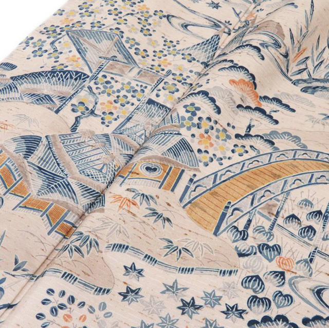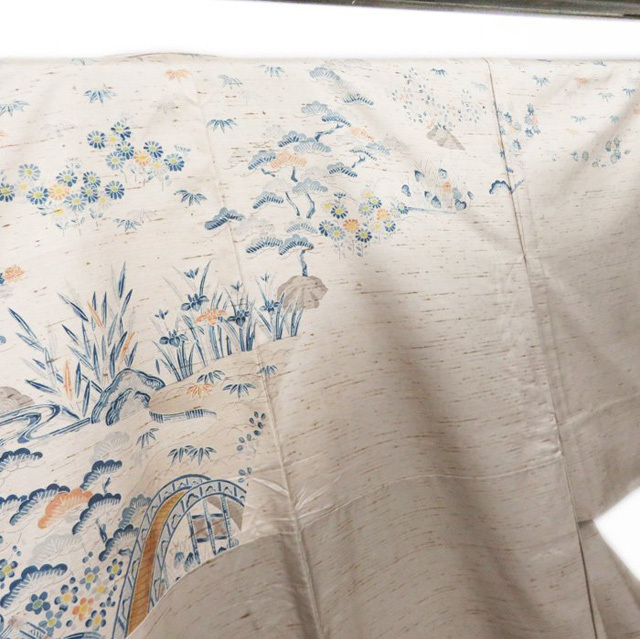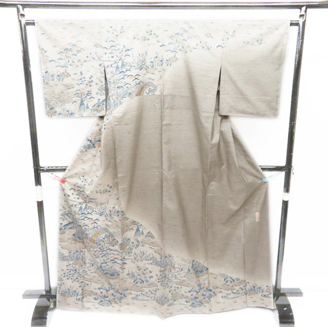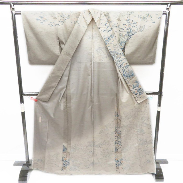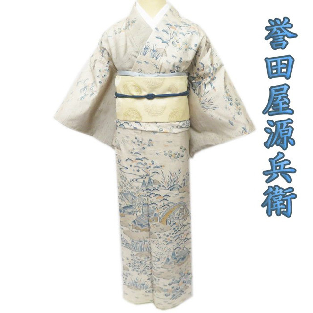 丈168cm(+8) 裄63cm(+2.5) 袖丈50cm(+9) 前幅25cm 後幅29cm ※サイズのお直し、承ります。 (身丈のみ、身幅のみのお直しは承っておりません) ※身丈は肩から測っております。 ※()内はおおよそのお直しいただける長さです。胴裏の長さ等によって()内の長さ通りお直しできない場合があります。 単位:cm 素材 正絹 商品ランク C ●着用時期 6月、9月(+-2週間) ●着用シーン お出かけ、観劇、お買い物など ●お色 白茶系色 京都で創業270年以上を誇る老舗問屋【誉田屋源兵衛】。 代々受け継がれてきた技術とともに活動方針の模索を進め、近年では帯だけにとどまらず、有名画家・松井冬子とコラボレーションした帯と着物の展覧会を開催。ファッションブランドであるユナイテッドアローズと組んで誂えの着物と男性用の浴衣も発表しています。 この機会に是非お手元にお迎えくださいませ。 左前身、衽、左前袖に薄シミがございますが、まだまだご着用頂けるお品物です。 写真に写っている着物のみの販売で、小物等の付属品はついておりません。 一部商品は実店舗・他サイトでも並行して販売しておりますので売り切れの際はご了承ください。 その他多数販売中 kiku | ||||||