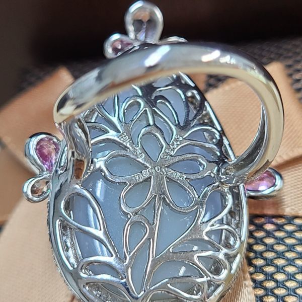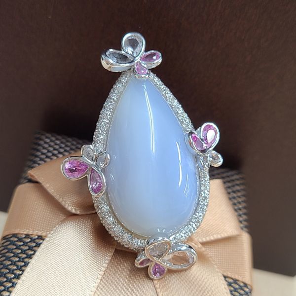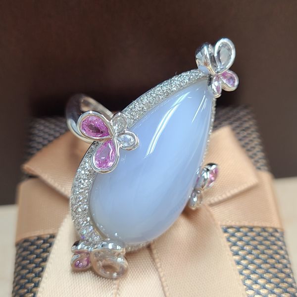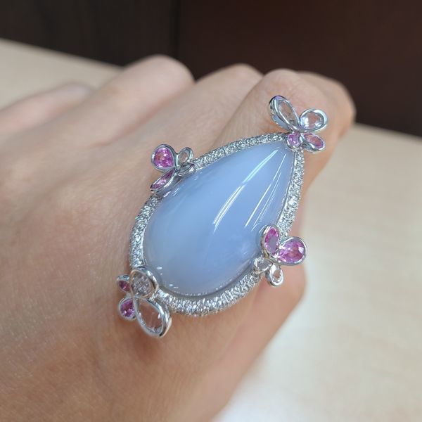 特大34.43ctのペアシェイプカルセドニーの美しい青色から目が離せない、上品なリングの登場です。