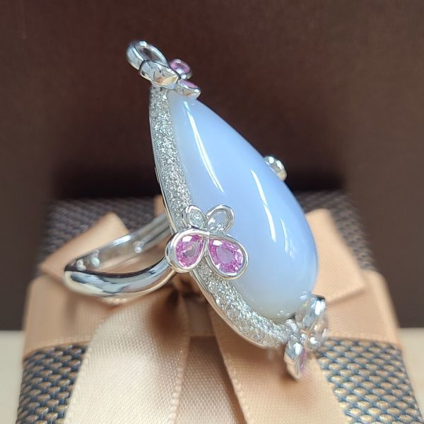 【鑑別書付】高品質!特大 天然 ペアシェイプ カルセドニー K18 ホワイトゴールド 18金 蝶々 リング 指輪 パワーストーン