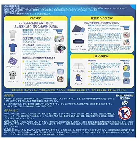 ■成分:過炭酸ナトリウム(酸素系)、界面活性剤(エトキシレートアルコール)、水軟化剤(炭酸ナトリウム)、洗浄補助剤