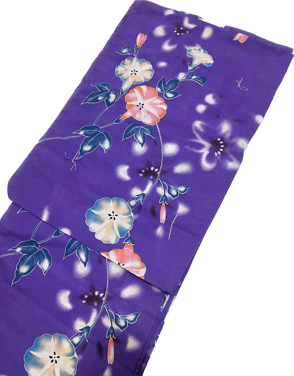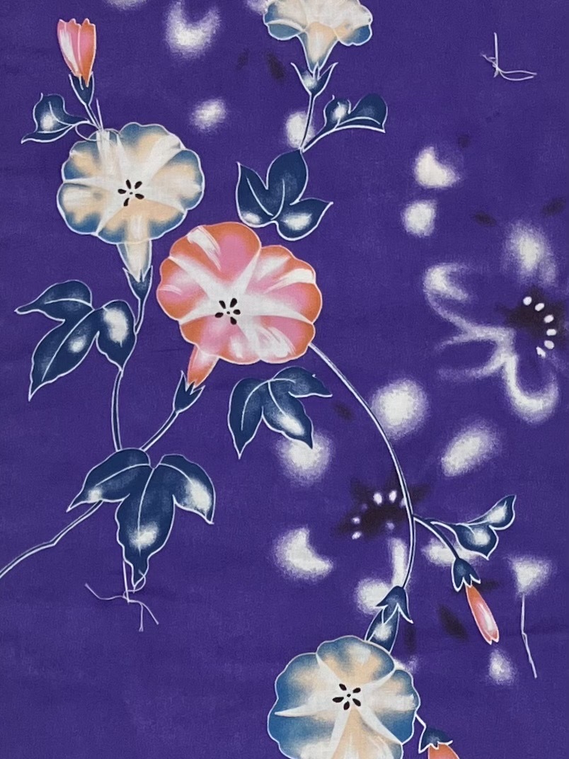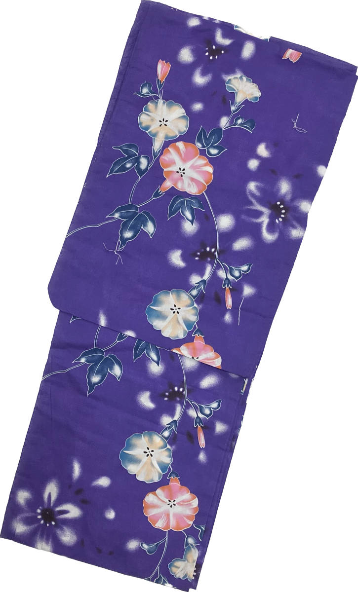 紫地にあさがおを配した目を惹くデザインの、大人な印象の浴衣です。