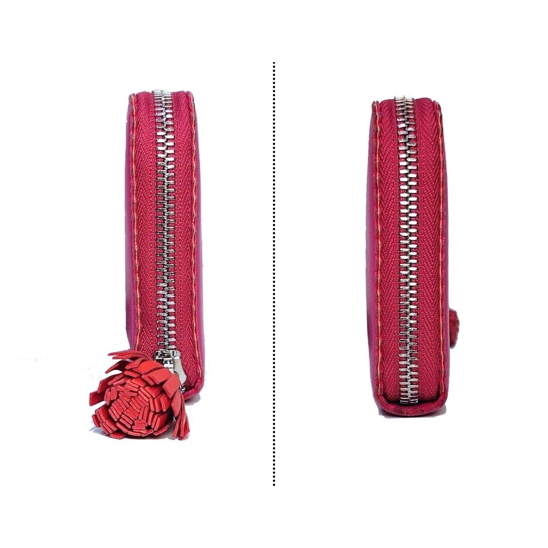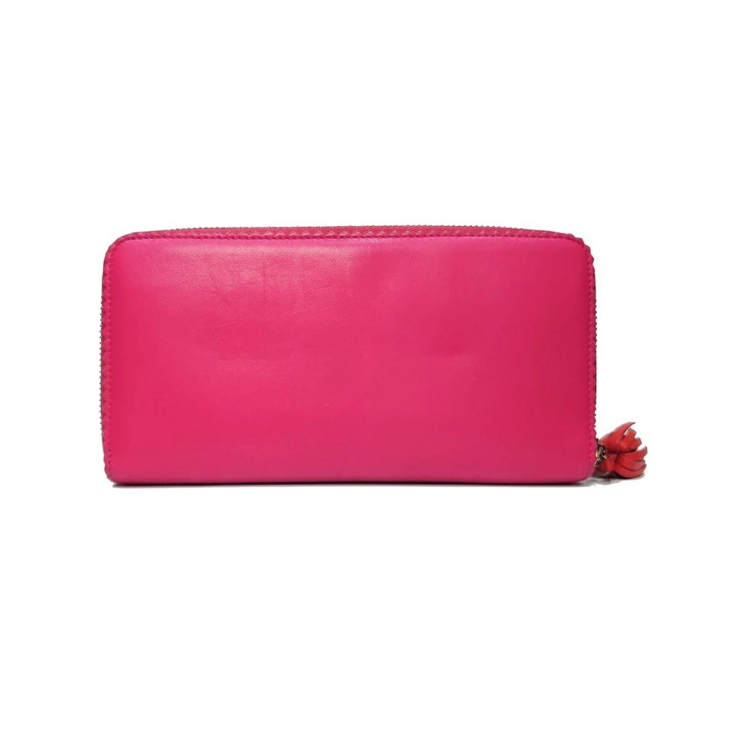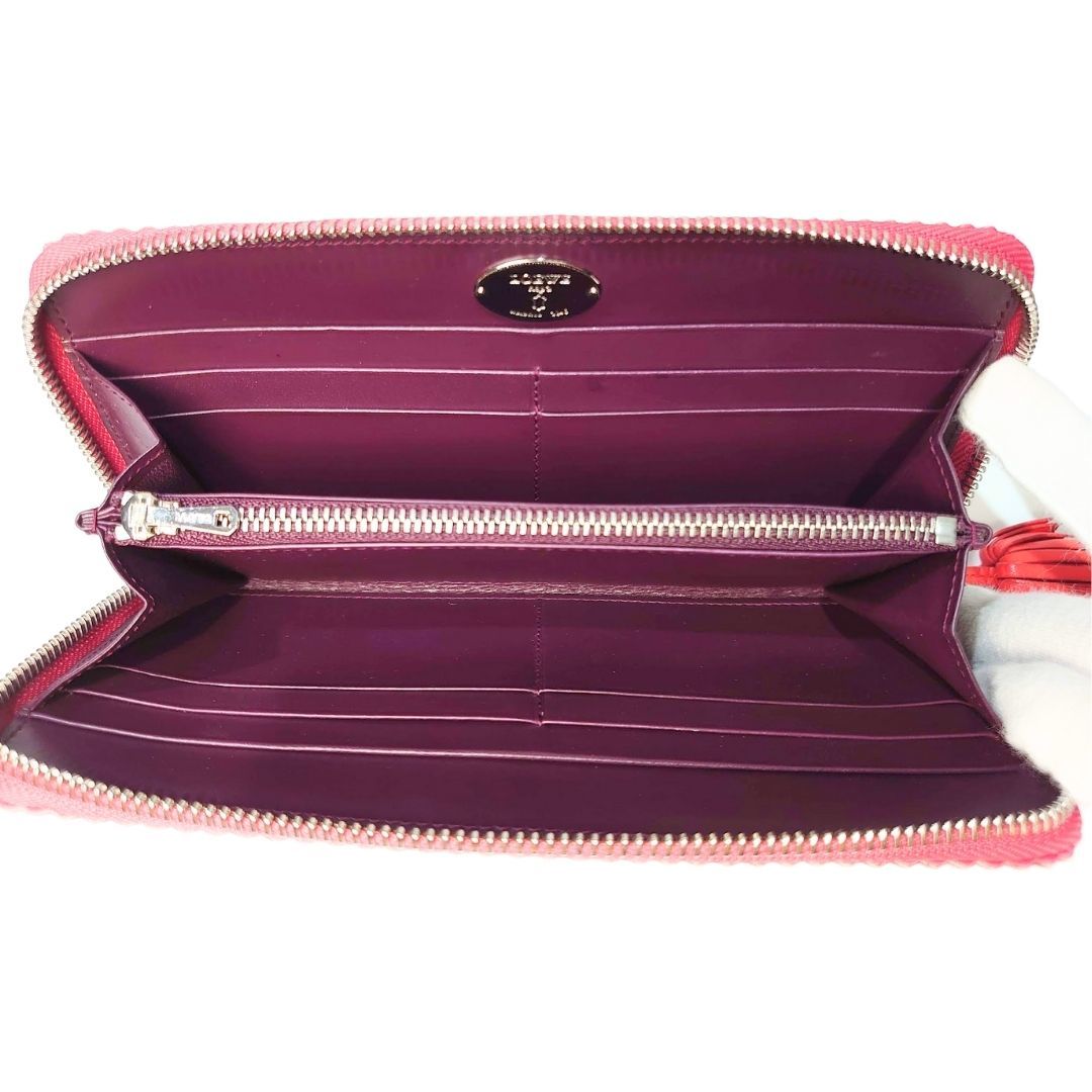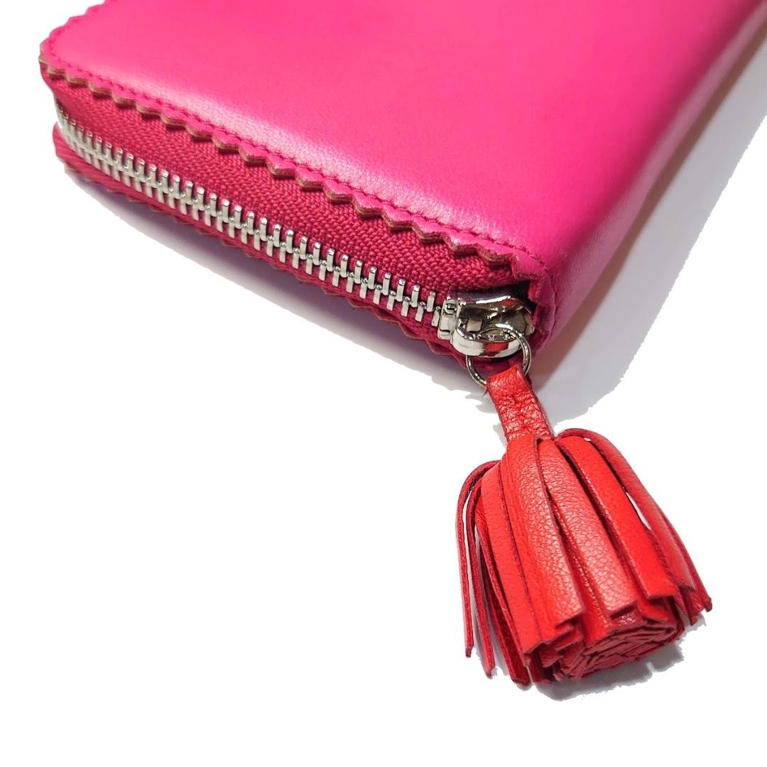 ◎鮮やかなピンクのレザーとファスナーチャームのフリンジ・タッセルが目を惹くLOEWEの長財布です。
