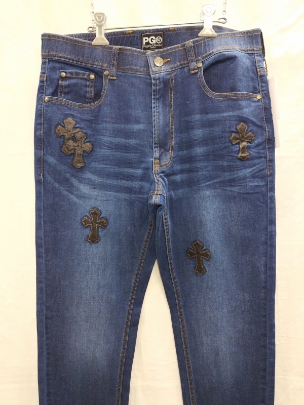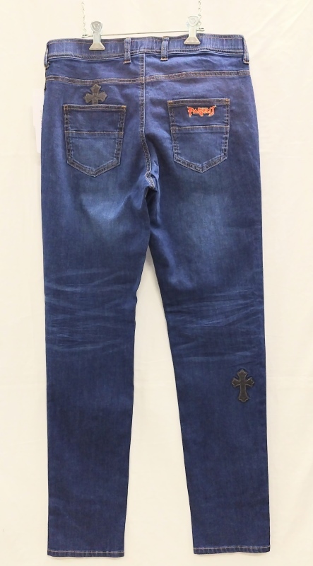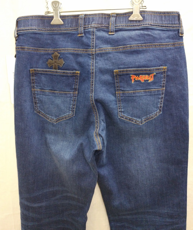 パジェロの薄手デニムストレッチジーンズです。31-5303-07新品 47色 W76綿:97% ポリウレタン:3%アップリケ部分:牛革(76cm表示の実寸です)ウエスト:78cm 股上:25cm股下:80cm 裾幅:16cm薄手ストレッチデニム生地です。ウエストの横から後ろ側がゴム入りです。です。十字架の牛革アップリケが前後に付いています。後ろポケットにロゴの刺繍入りです。定価¥30800です。水曜日は定休日ですので、連絡、発送等の取引業務は 出来ませんのでよろしくお願い致します。 定休日以外連絡可能な時間は、11時~18時迄です。