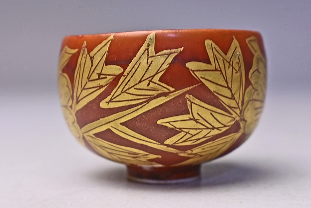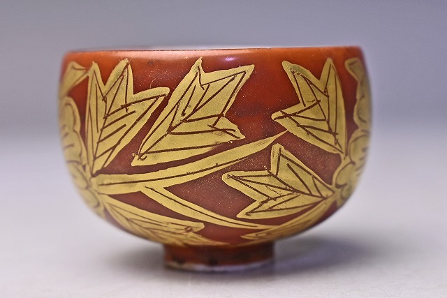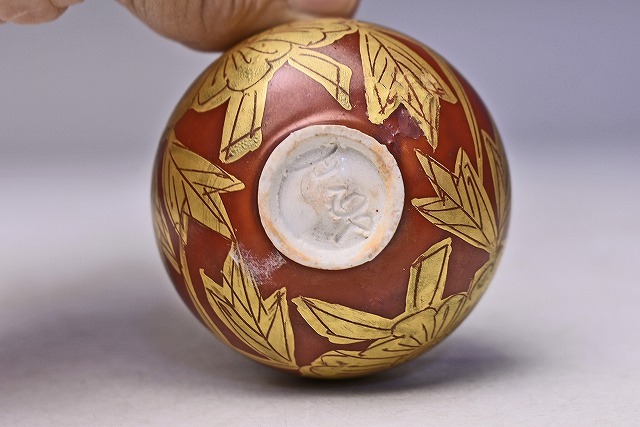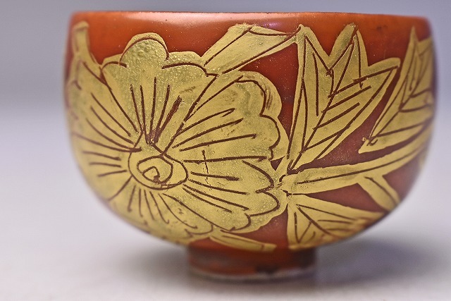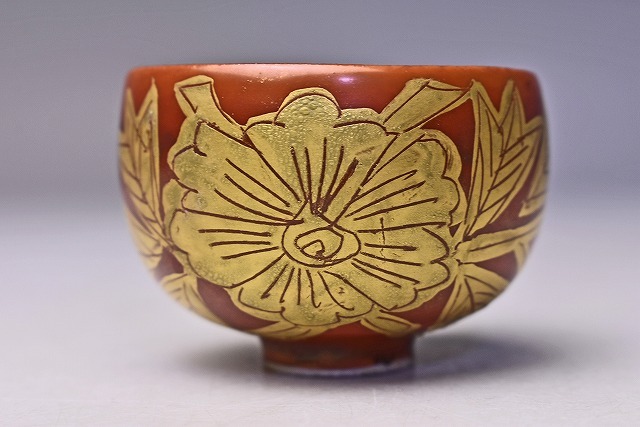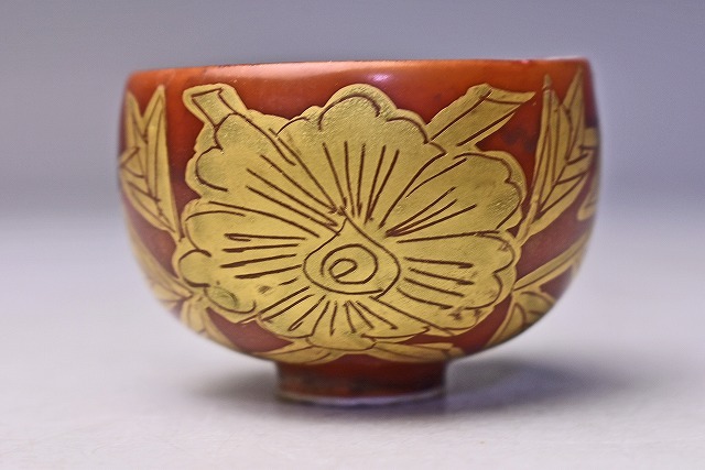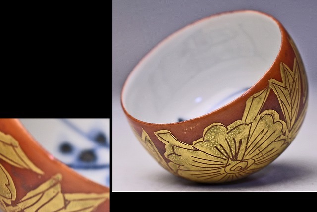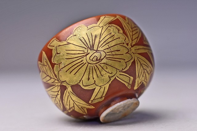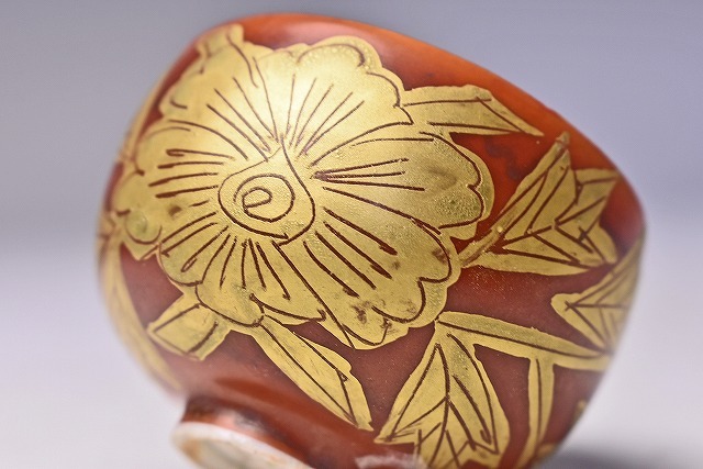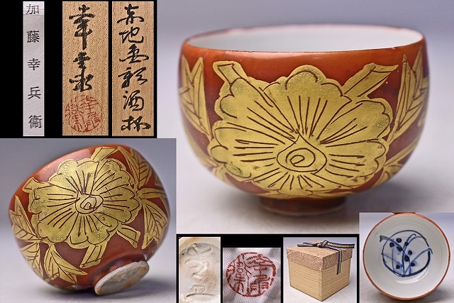 加藤幸兵衛 5代 ★ 赤地 金彩 ぐい呑 ★ 共箱 共布 栞 ★ 上作 ★ 大きな花文が雅な金襴手の逸品 ★ 酒器 盃 杯 ★