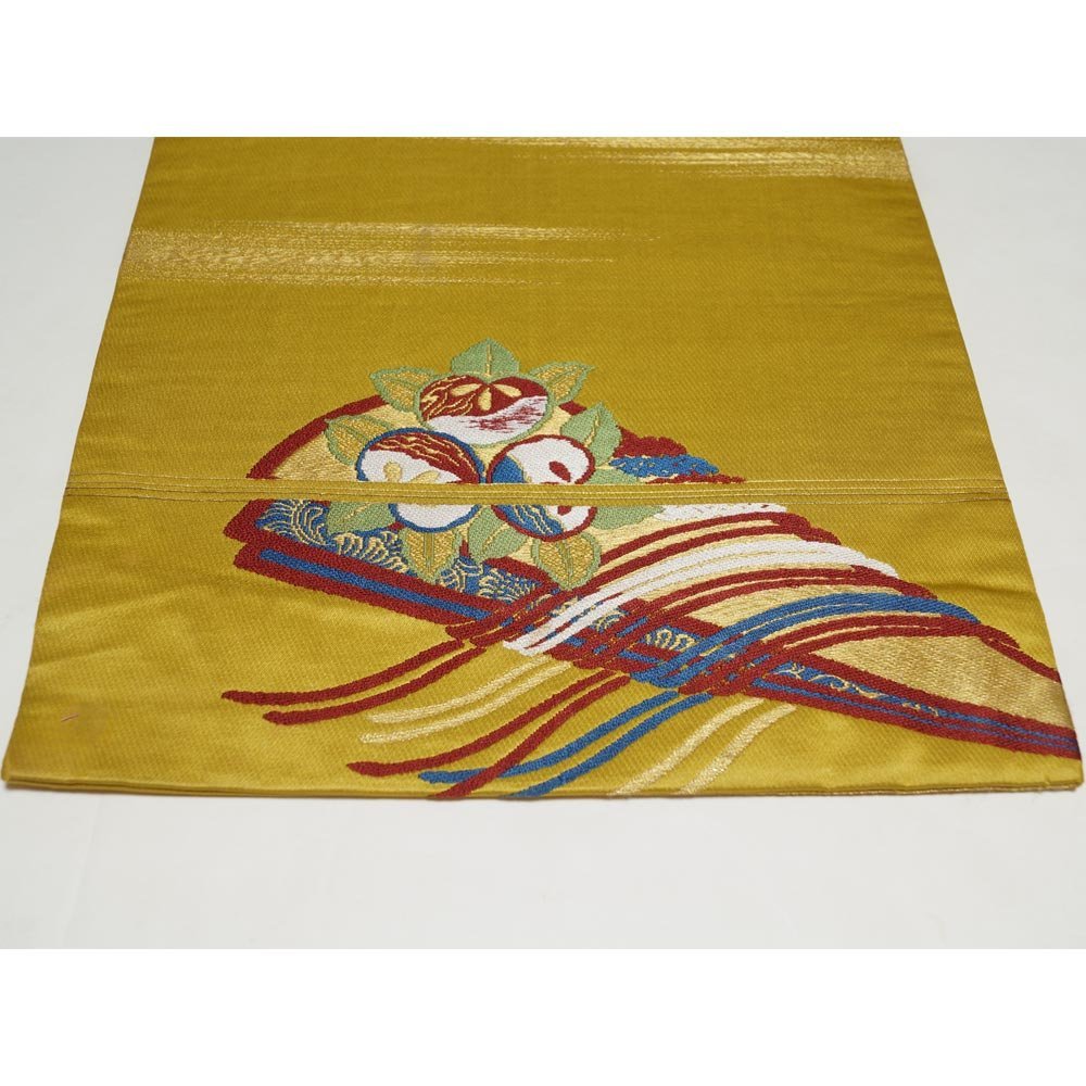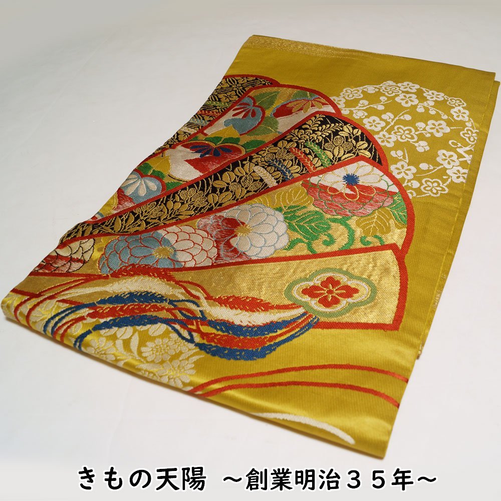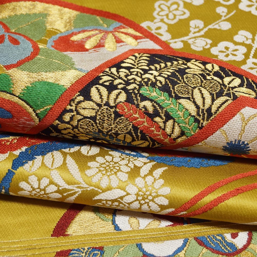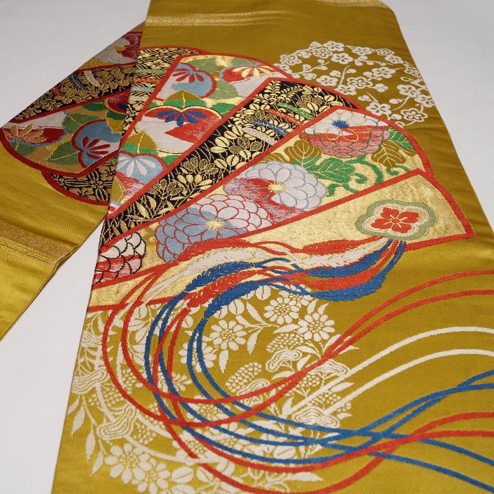 商品 説明 | 鶸色系の繻子の地に檜扇に百花模様が施されたアンティーク名古屋帯です。 |
