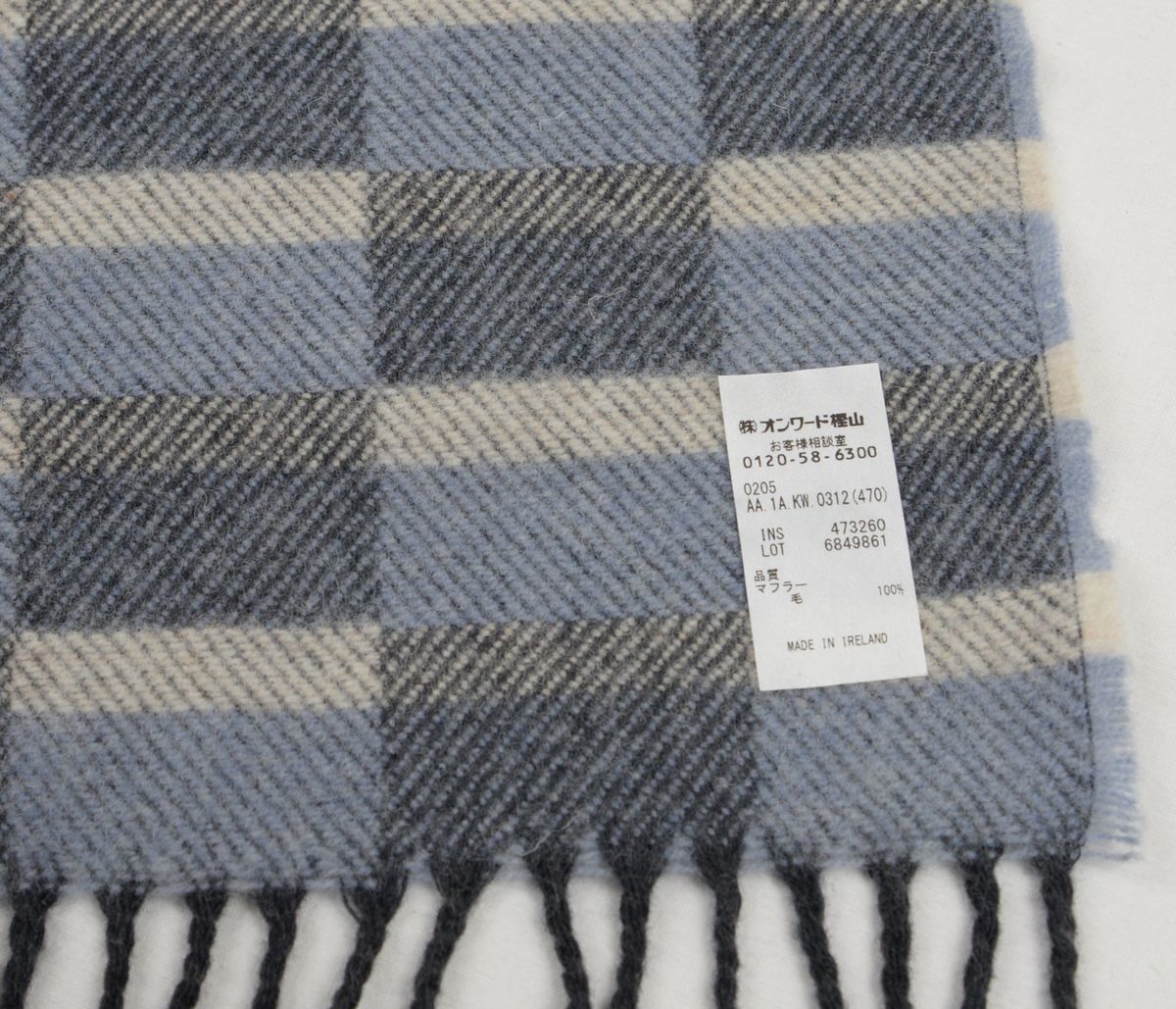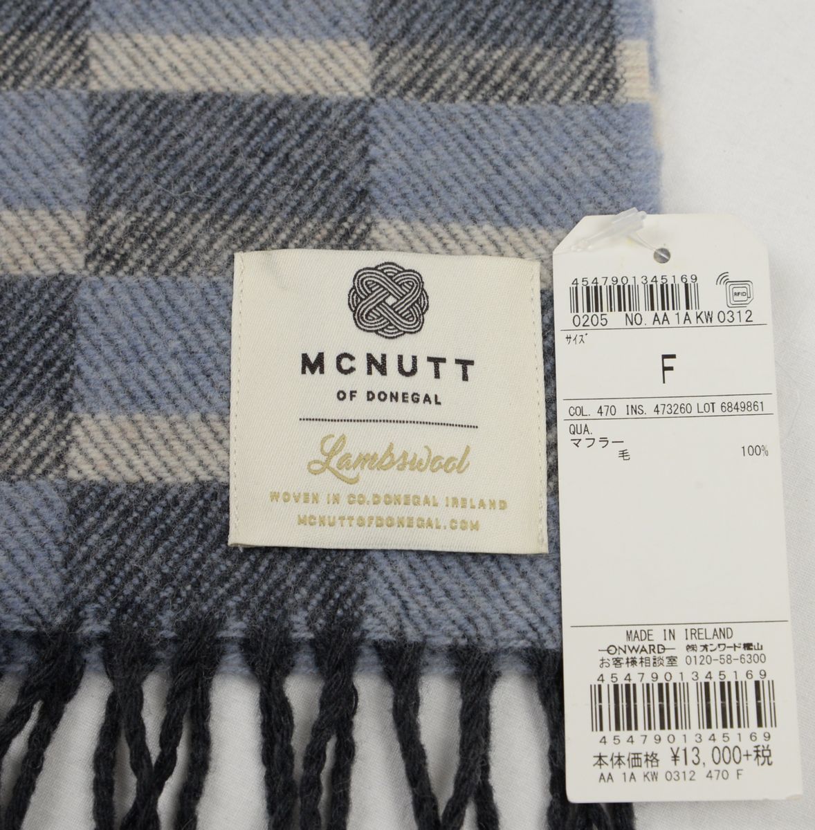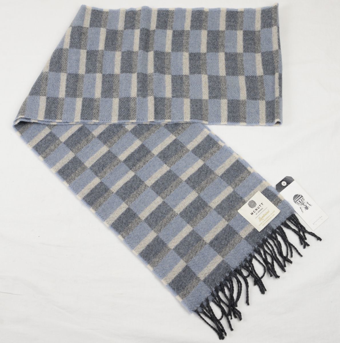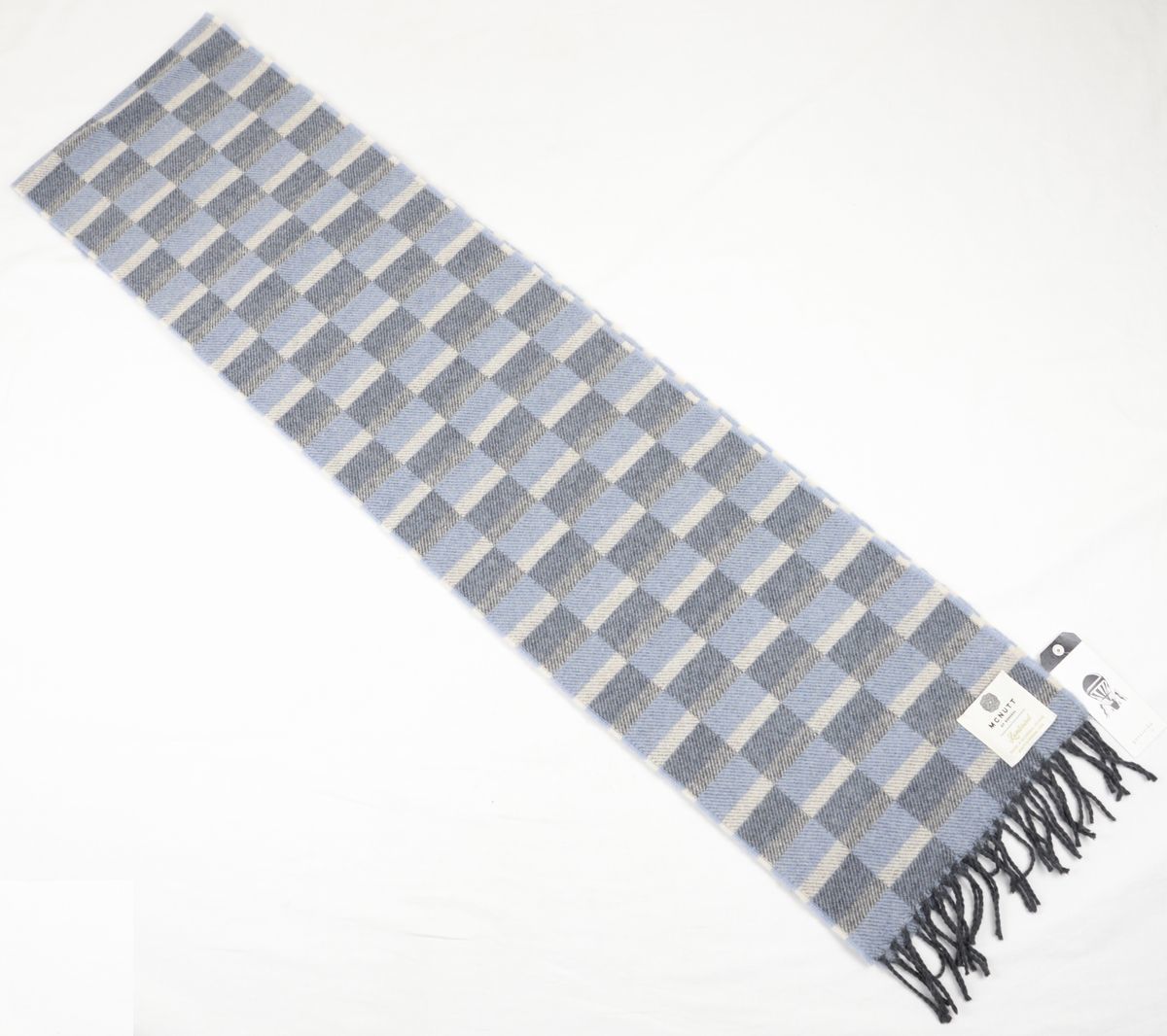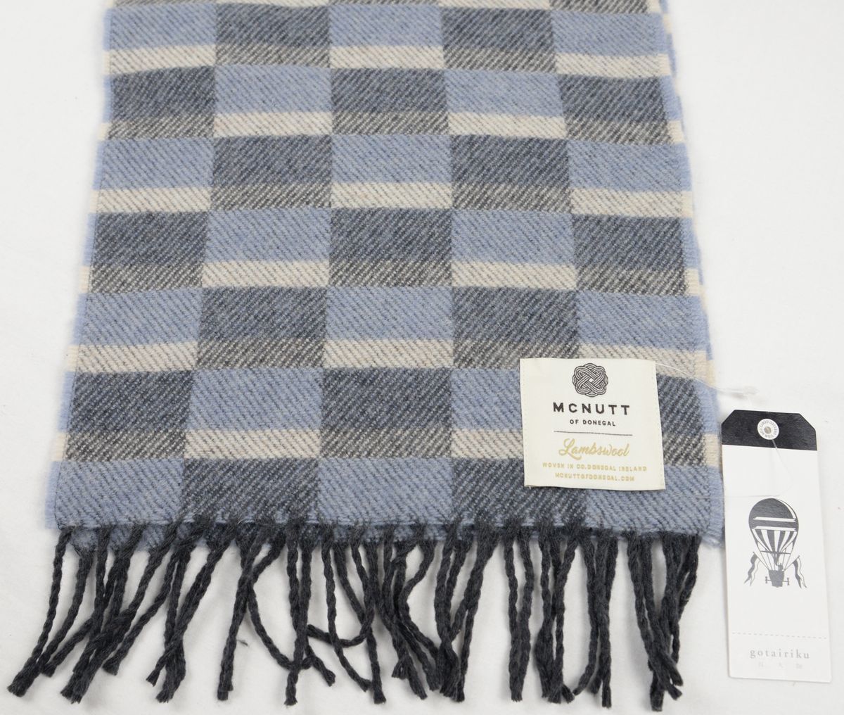 ●McNutt(マクナット)(gotairikuコラボ)マフラー(チェック,灰・青灰・白,毛100%,アイルランド製)新品