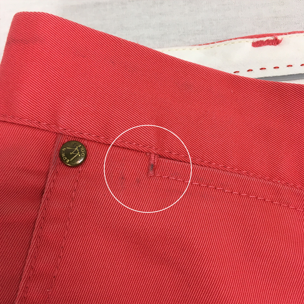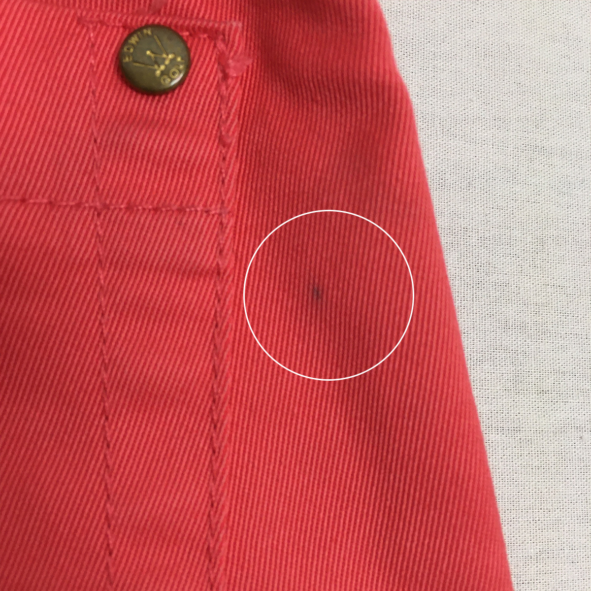 正面左足の付け根あたりと、右ポケットあたり、背面右ポケット横に薄い汚れがあります。