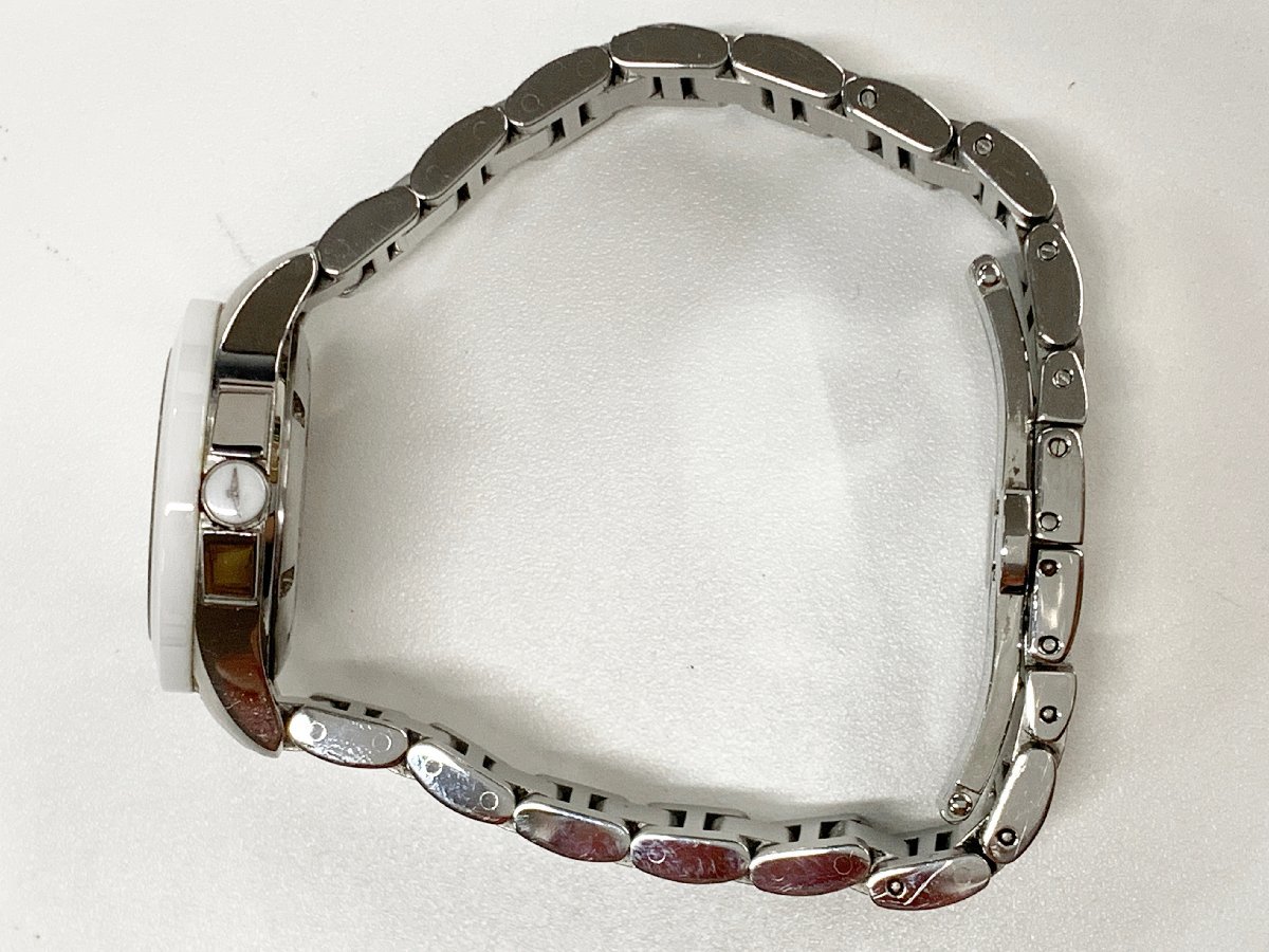セラミックとステンレスを組み合わせたブレスレットは全体的に爽やかな印象ですが、文字盤の11Pダイヤの輝きが華やかさをプラスしてくれます。