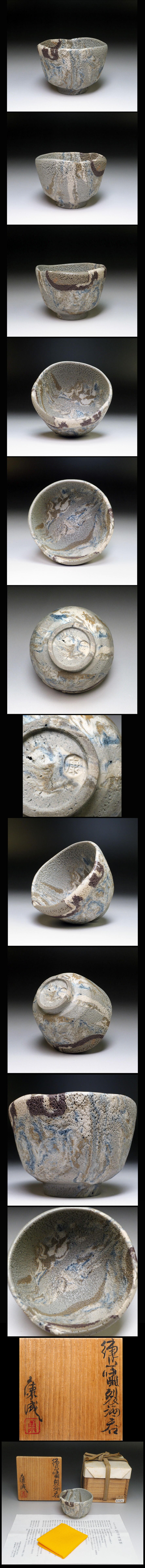 ![]() 練上手の人間国宝、松井康成のぐい呑「練上嘯裂酒呑」です。 作品に印銘があります。 サイズ:約 径 6.7cm 高 4.8cm 共箱・布・栞付 作品状態:無傷で美品です。(目視確認です。) こちらの作品は真作保証の安心頂ける作品であることをお約束いたします。 不明な点は、入札前に質問等でご確認下さい。 松井康成 昭和2年(1927)~平成15年(2003) 重要無形文化財「練上手」保持者(平成5年認定) 長野県に生まれる。明治大学文学部を卒業後、笠間市の古刹月崇寺の住職を継ぎ、昭和35年境内に築窯し、広く中国古陶磁の技法を研究した後、練上に絞った作陶活動を展開させていった。練上は、色や濃淡の異なる土を組み合わせていくことによって様々な文様を表す技法であるが、性質の異なる二種類以上の陶土を用いるため、土の収縮率の違いなどから乾燥や焼成の段階で割れることも多く、高度な技術を要する。松井は、練上で用いる色土の収縮率を同じにするための研究を重ね、練上技法を様々に応用して次々と独自の手法を発表し、陶芸界に新生面を切り拓いた。 | |||