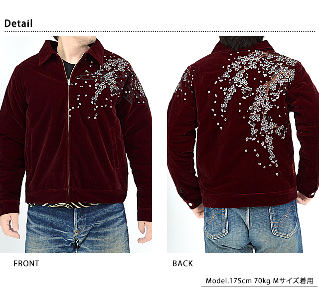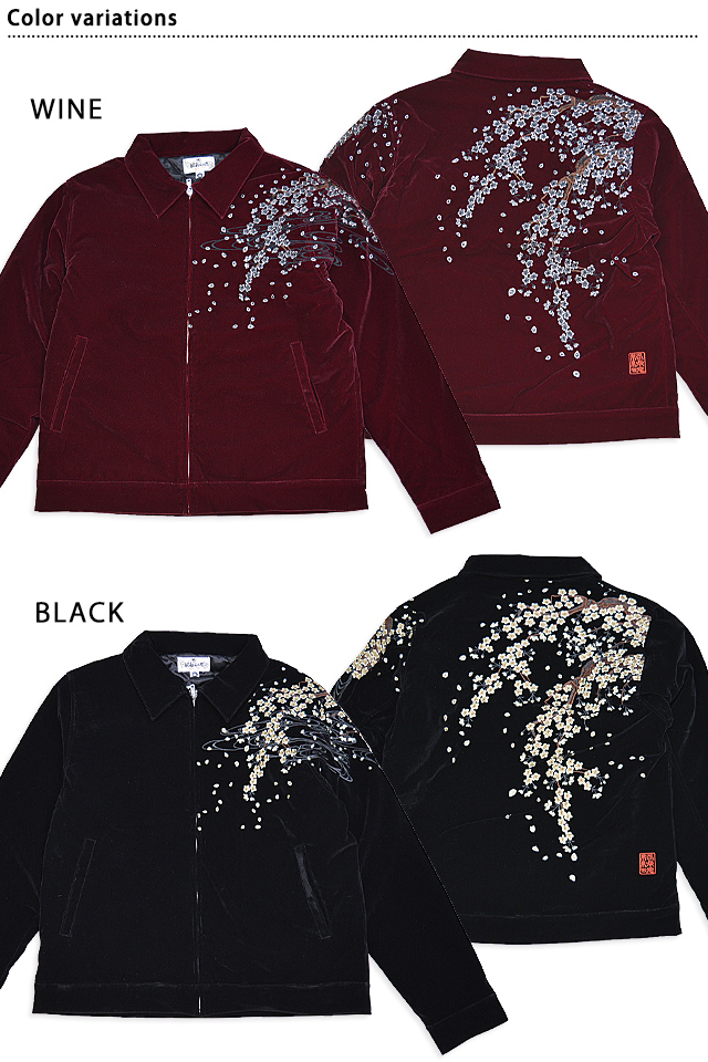 絡繰魂さんから「枝垂れ桜ジャケット(234009)」のご紹介です。 人気の桜をモチーフの主役に採用したドリズラージャケットが登場しました! ボディーには別珍生地を採用し、マットな質感をお楽しみ頂けます。 中綿も入っておりますので、保温性にも優れています。 フロントはジップアップ仕様。 柄は総刺繍で表現。 様々なアイテムに相性抜群の逸品です。 | |||||||||||||||||||||||||
