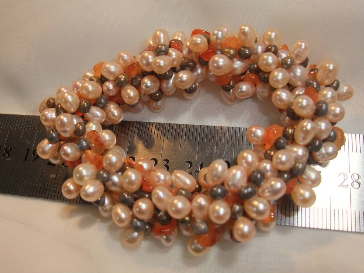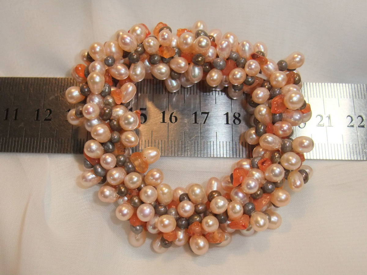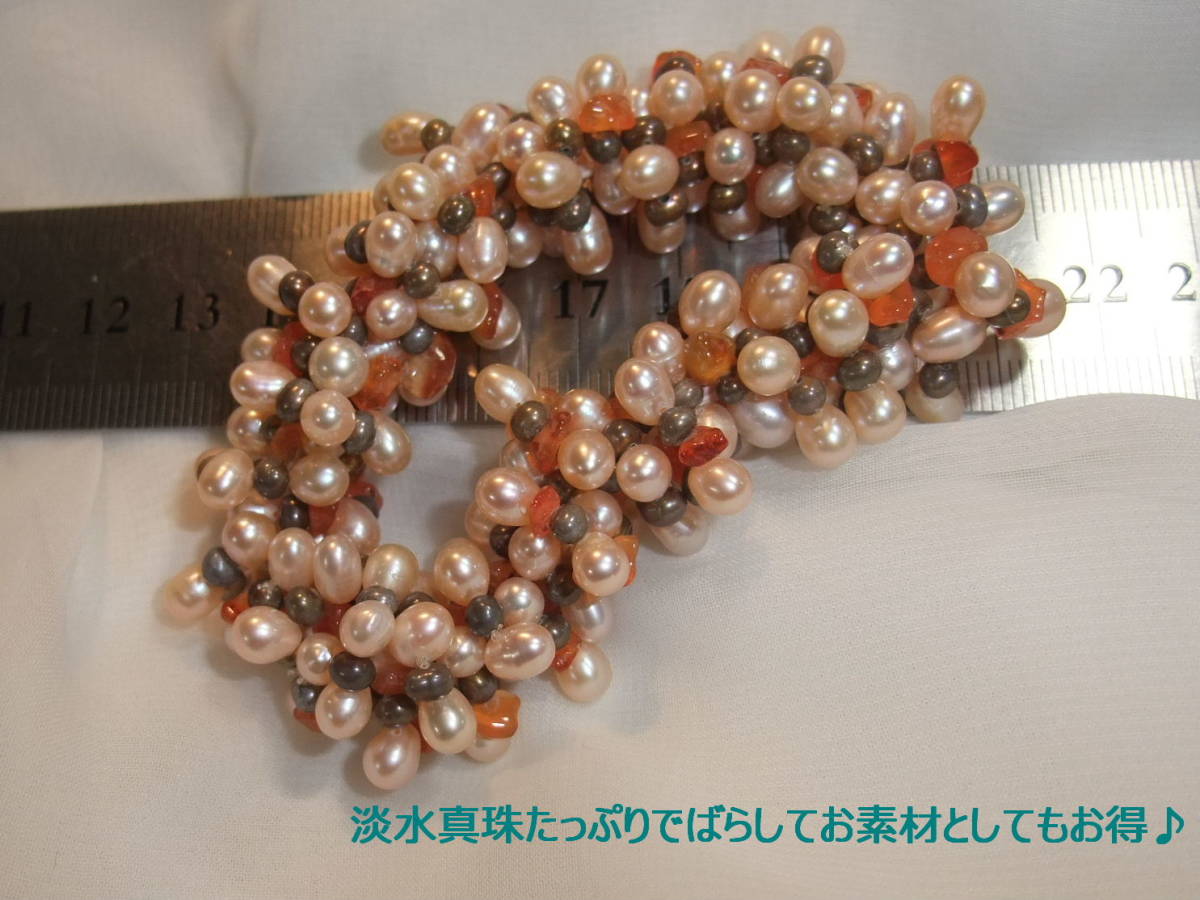 146-3 たっぷりゴージャス淡水パールゴムブレスレット ピンクオレンジ系 パーティ