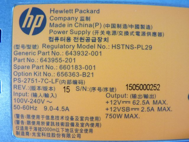 HP ProLiant DL360p Gen8 の 冗長 電源 750W HSTNS-PL29 REV:15 / 643932-001 643955-201 660183-001