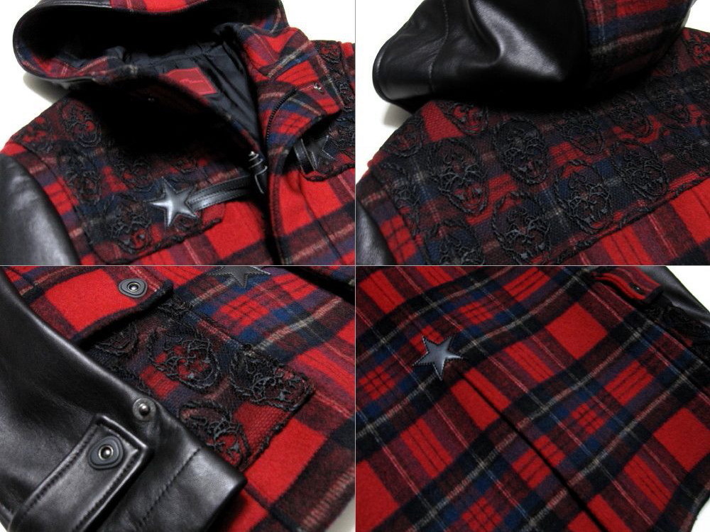 レッドのチェックとブラックレザーが格好良いダッフルコート。