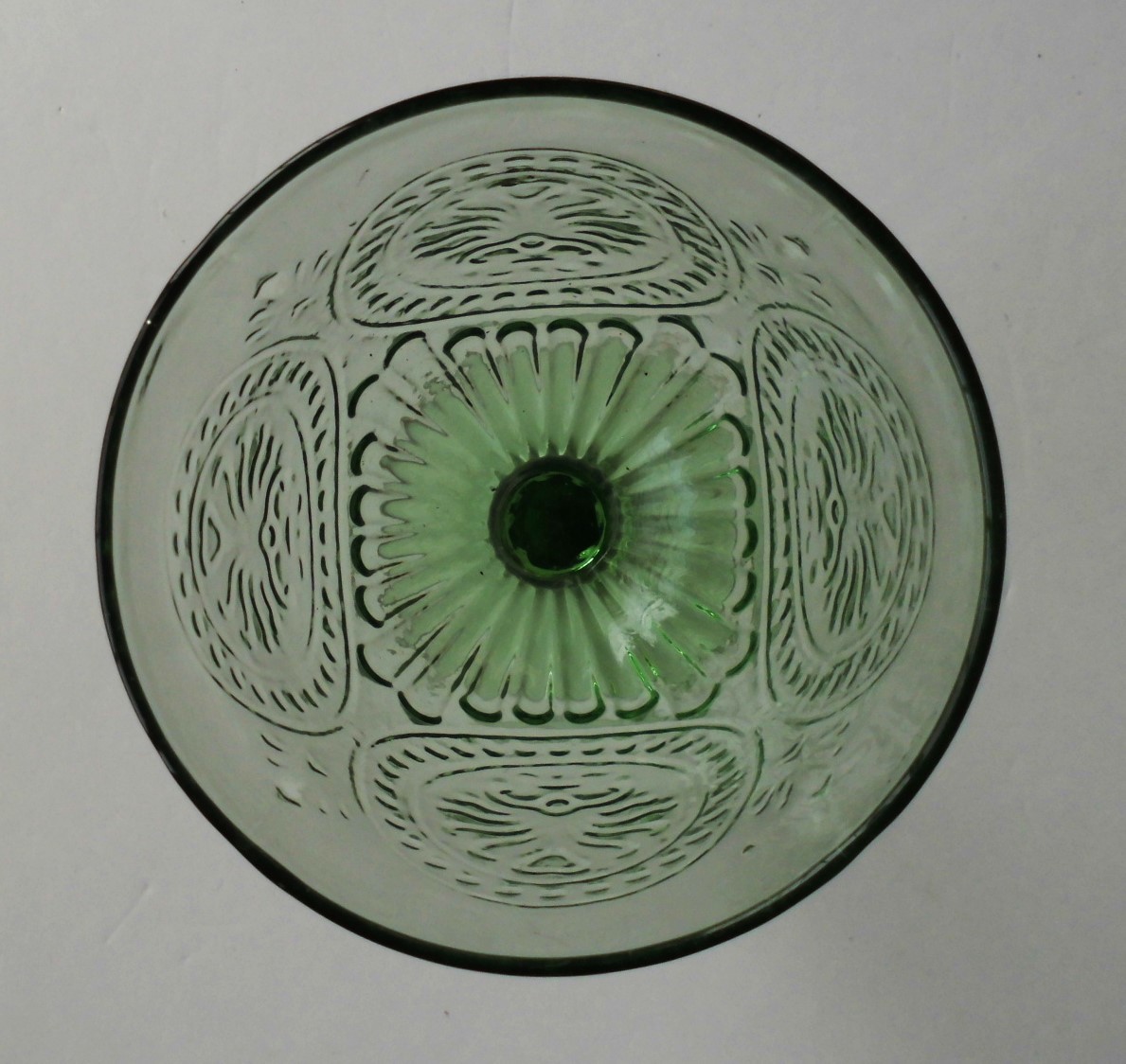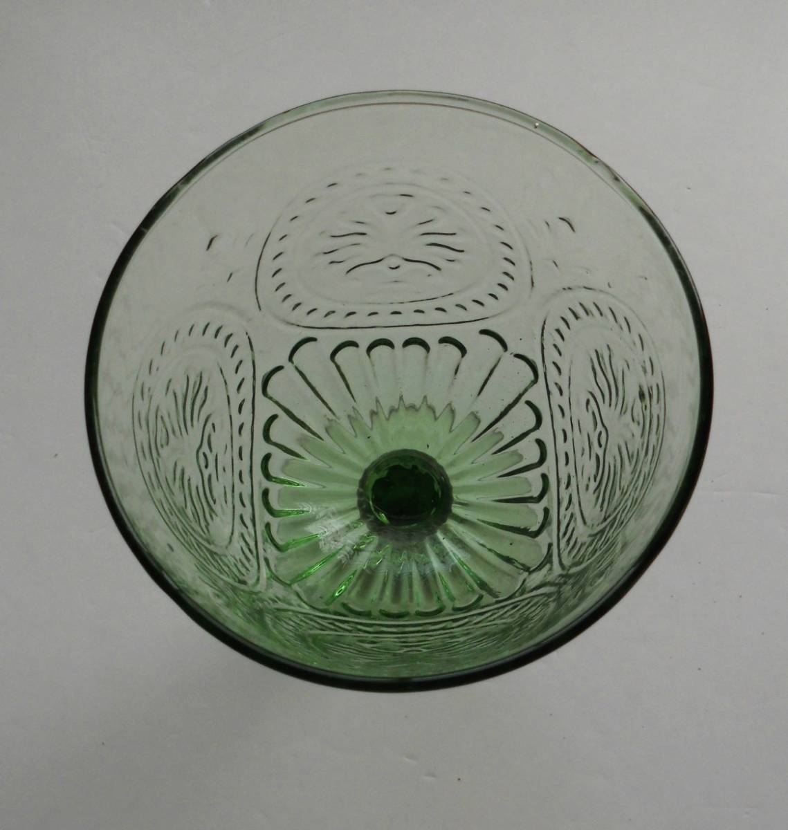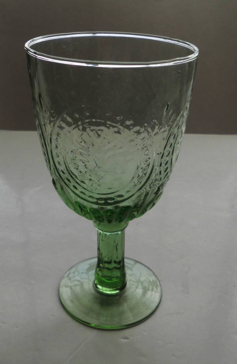 ☆大きな脚付きガラスコップ★エンボス仕様★高さ17.5cm×径9.7cm★緑色ガラス・グリーンガラス★