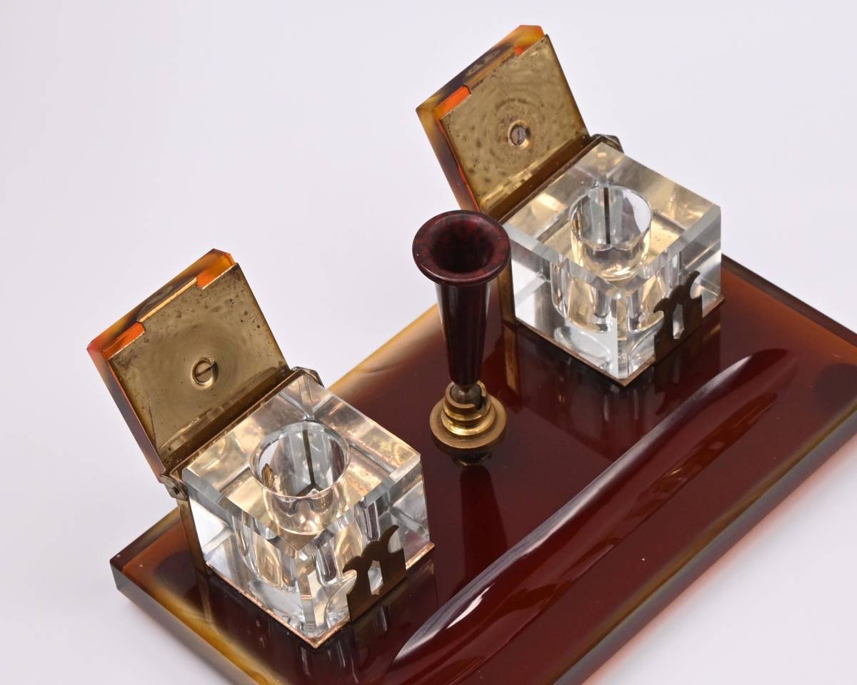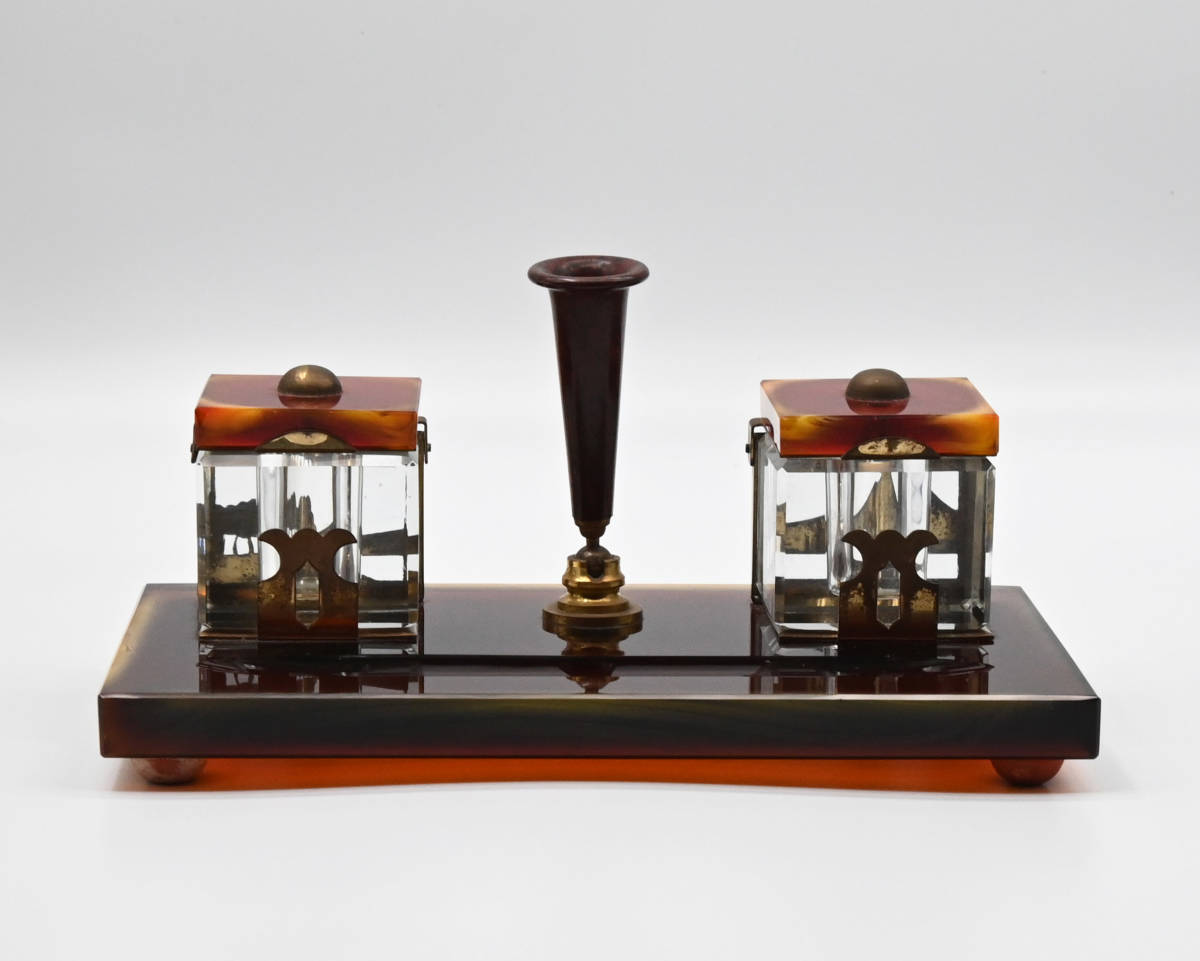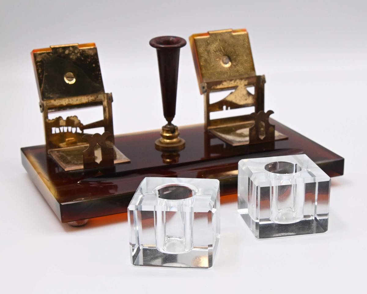 茶ガラスの卓上ペンスタンド インク壺二つ&ペンスタンド 卓上小物 昭和レトロ