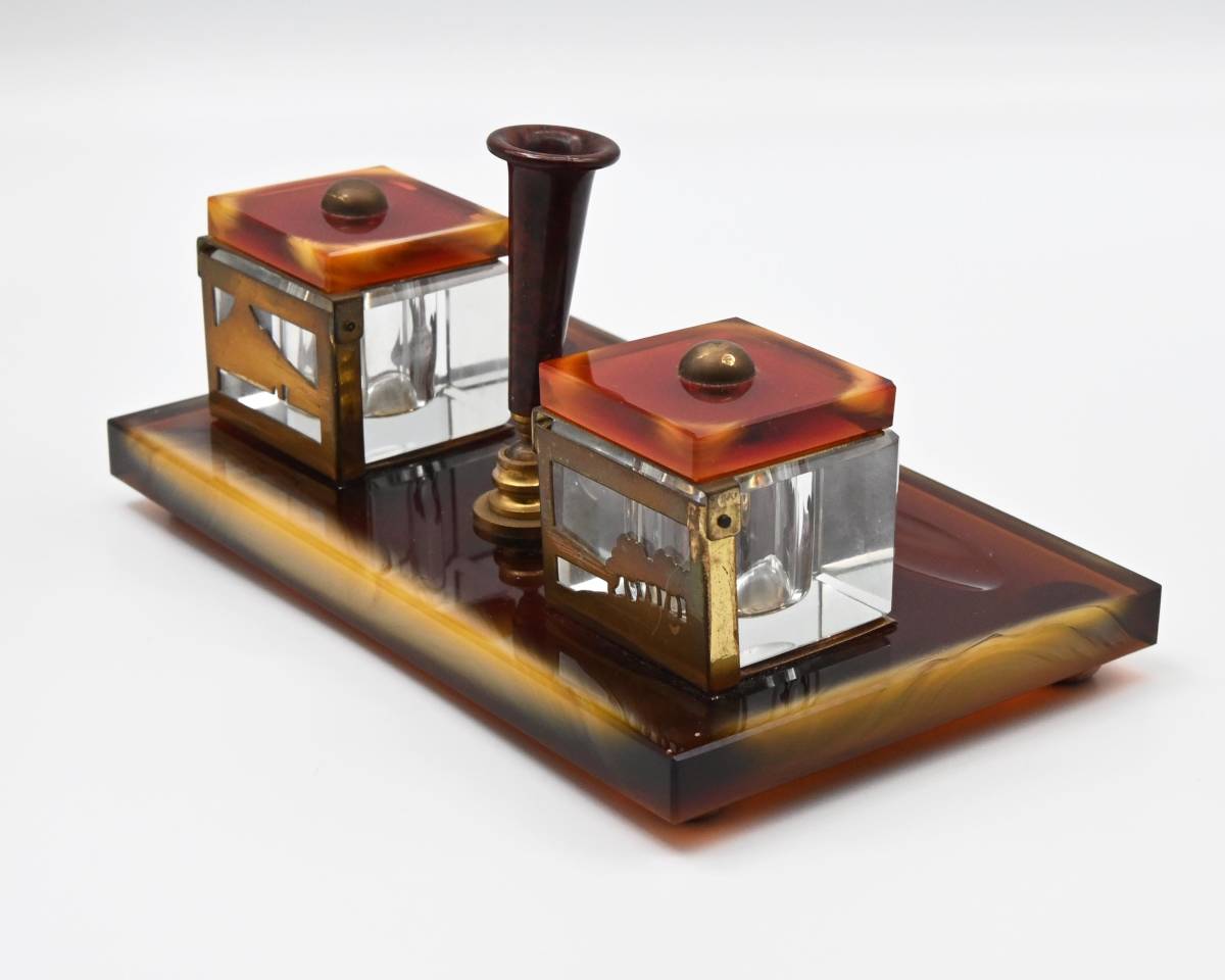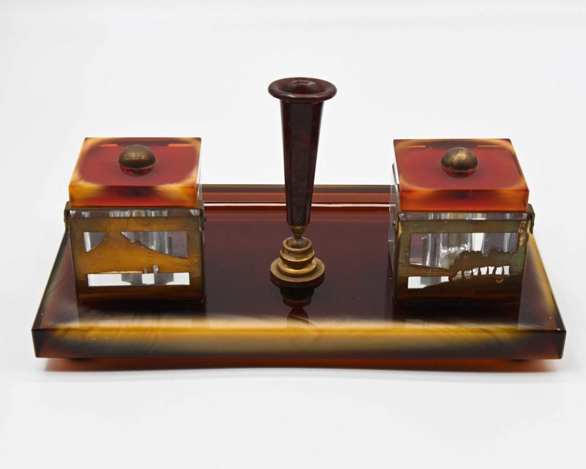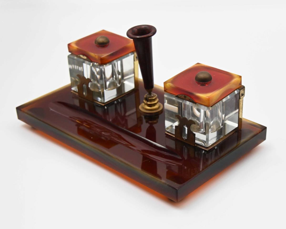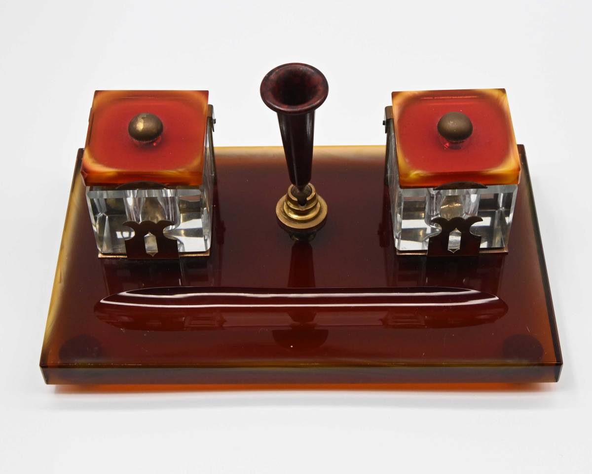 茶ガラスの卓上ペンスタンド インク壺二つ&ペンスタンド 卓上小物 昭和レトロ