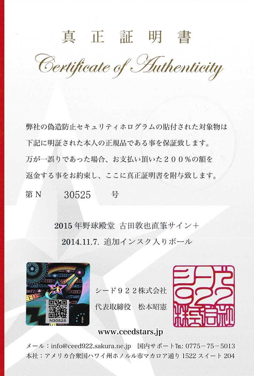 本物を証明するシードスターズ真正証明書付き(シリアルナンバー:N30525)  特許取得。日本で唯一、直筆サインの価値を特許の力で守る証明書を発行。
