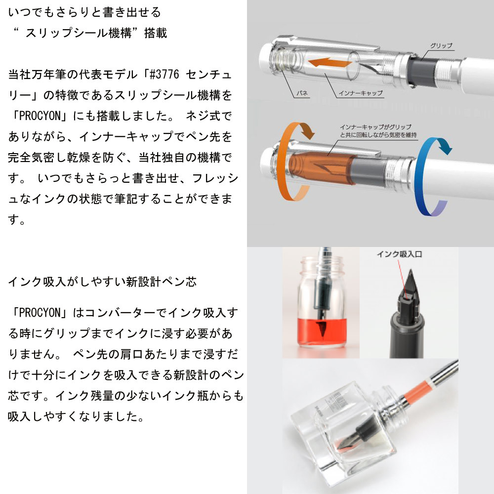 「PROCYON」はコンバーターでインク吸入する時にグリップまでインクに浸す必要がありません。 ペン先の肩口あたりまで浸すだけで十分にインクを吸入できる新設計のペン芯です。インク残量の少ないインク瓶からも吸入しやすくなりました。