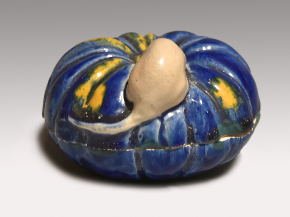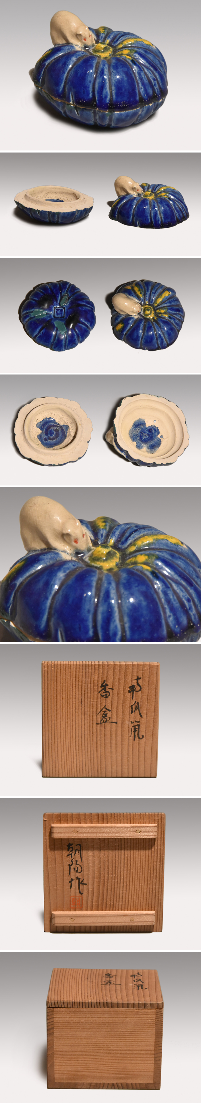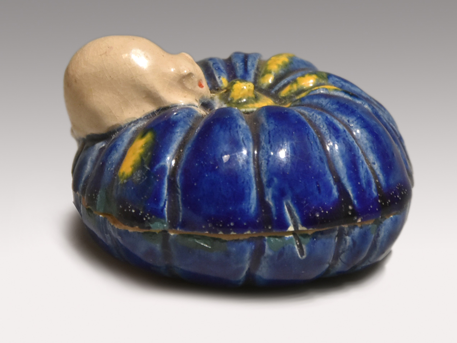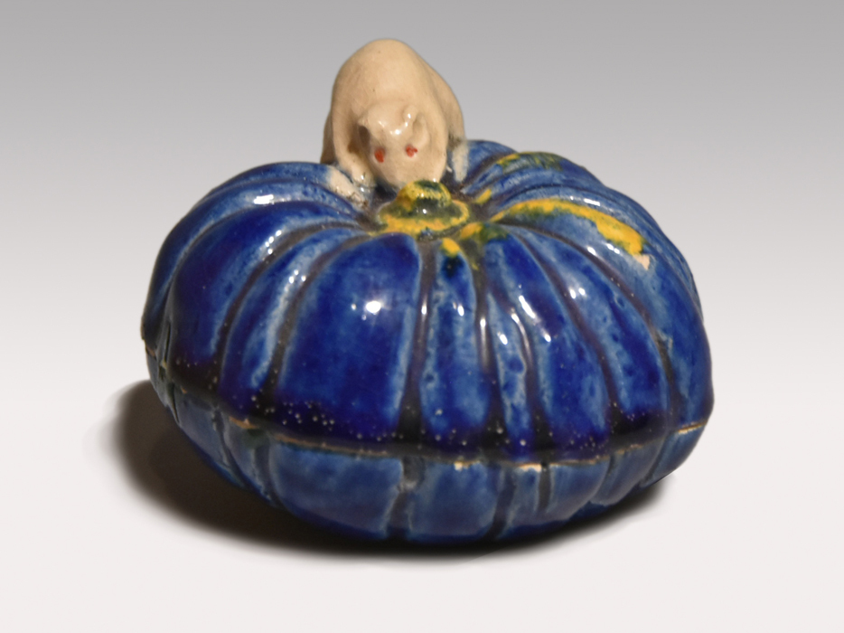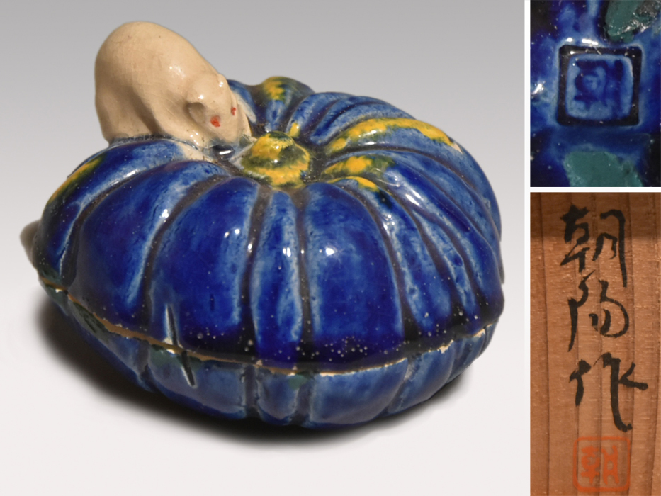 横山朝陽作の南京に鼠が乗っている構図の香合です。 ブルーの南京と白の鼠の対比が見事です。 底に陶印が捺されております。 キズ欠点なく良い状態です。 ※撮影の際に生じた写り込みなどがございます。 ご理解の程よろしくお願い致します。 |