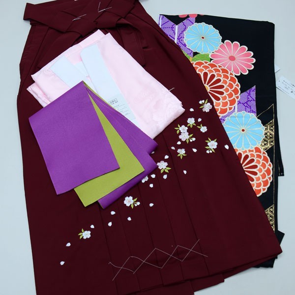 | 項目 | 着物袴フルセット(適合身長:約135cm~143cm:ジュニア用へお仕立て直し致します。) ・二尺袖着物絵羽柄 ・重ね衿(着物に縫いつけられています) ・二尺袖長襦袢(半襟付き) ・袴 ・袴下帯(浴衣帯にも使用できます。) |