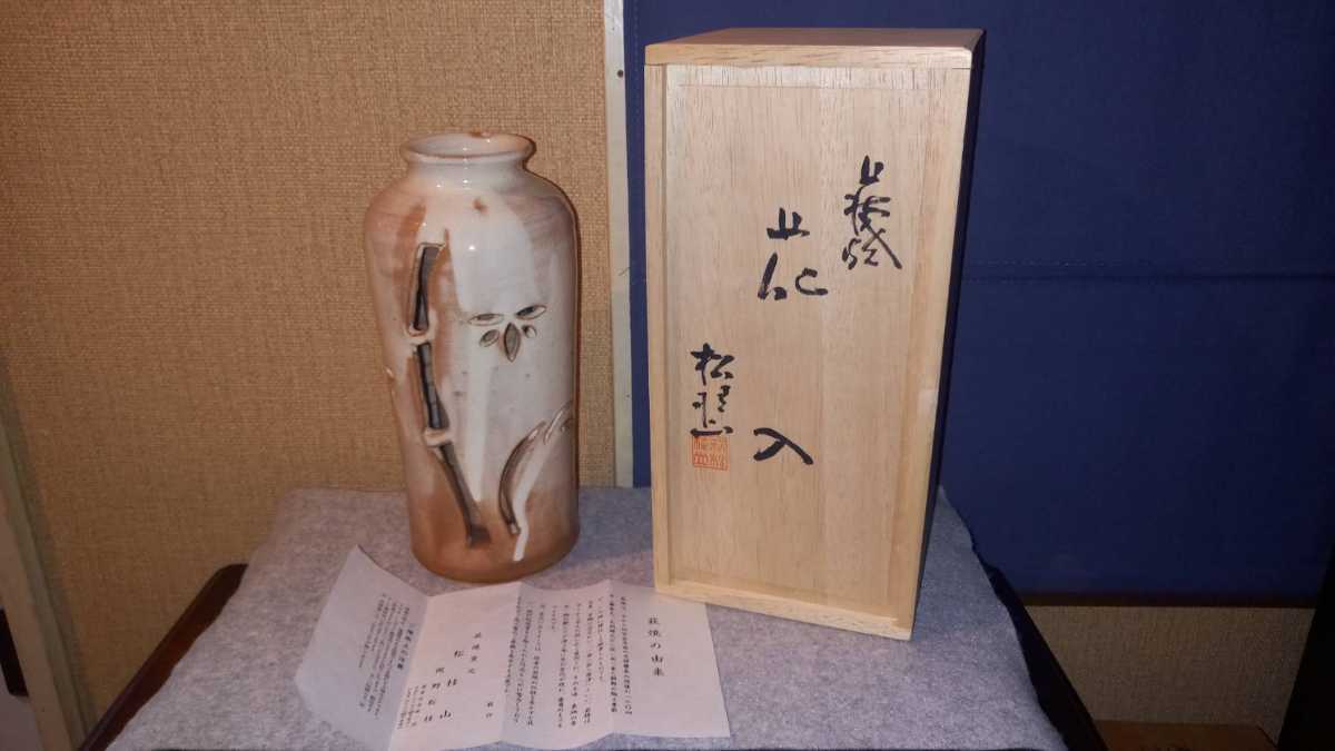 萩焼 窯元 松桂山 岡野松桂 造 花入 透かし 花瓶 花器 在銘 共箱 陶器 未使用保管 美品 中古