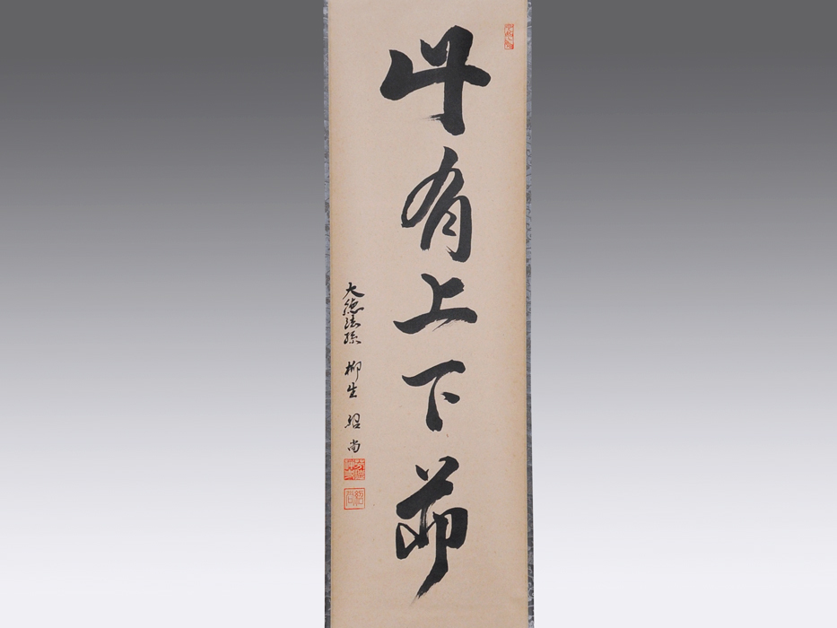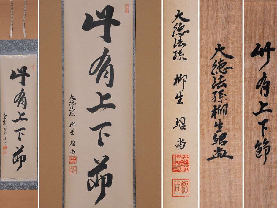 【真作】茶掛 橋本紹尚 直筆一行書「竹有上下節」です。 「竹有上下節」は松無古今色 竹有上下節(松に古今の色なく、竹に上下の節あり) 「松無古今色」とは松が春夏秋冬を通じ、枯れることなく青々と変わらぬものであるという意味。 「竹有上下節」とは真っすぐに伸びた竹には上下の節があるという意味。 古今と上下を並べ対比させた句で、差別即平等、平等即差別の意が込められている。 松と竹、ともに一年を通じて青々とした緑を有する植物で、おめでたいしるしとして用いられています。 表具は一文字、遠山金襴 中回し牡丹唐草緞子の上等な表具です。 シミ、折れ無く良い状態です。 ※撮影の際に生じた写り込みなどがございます。 ご理解の程よろしくお願い致します。 |