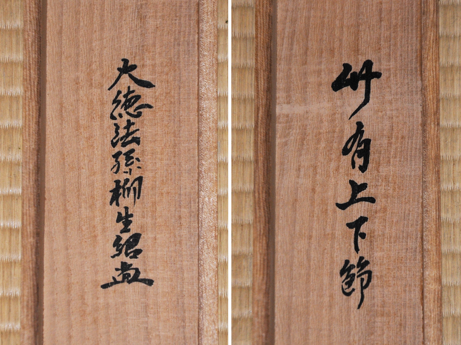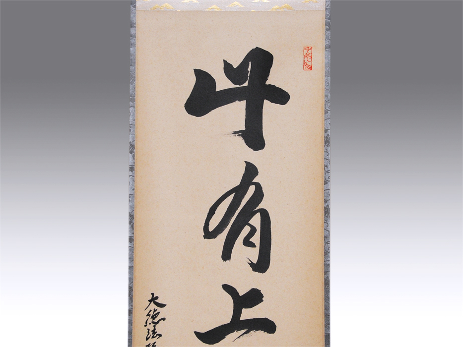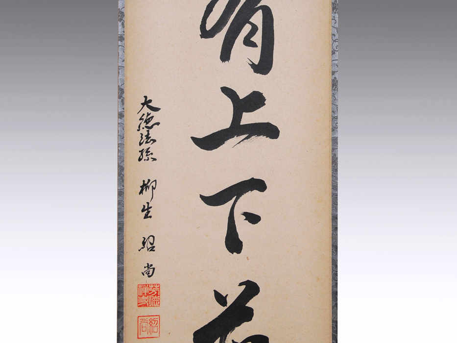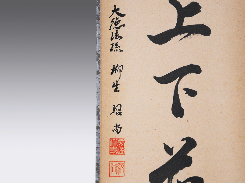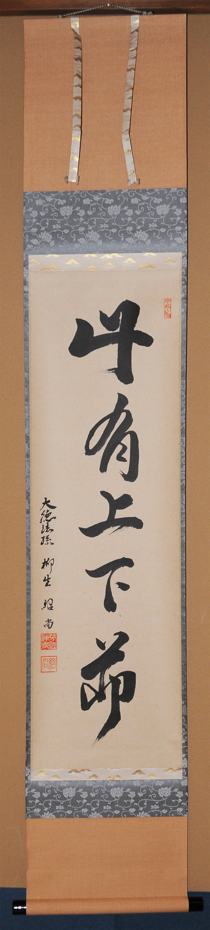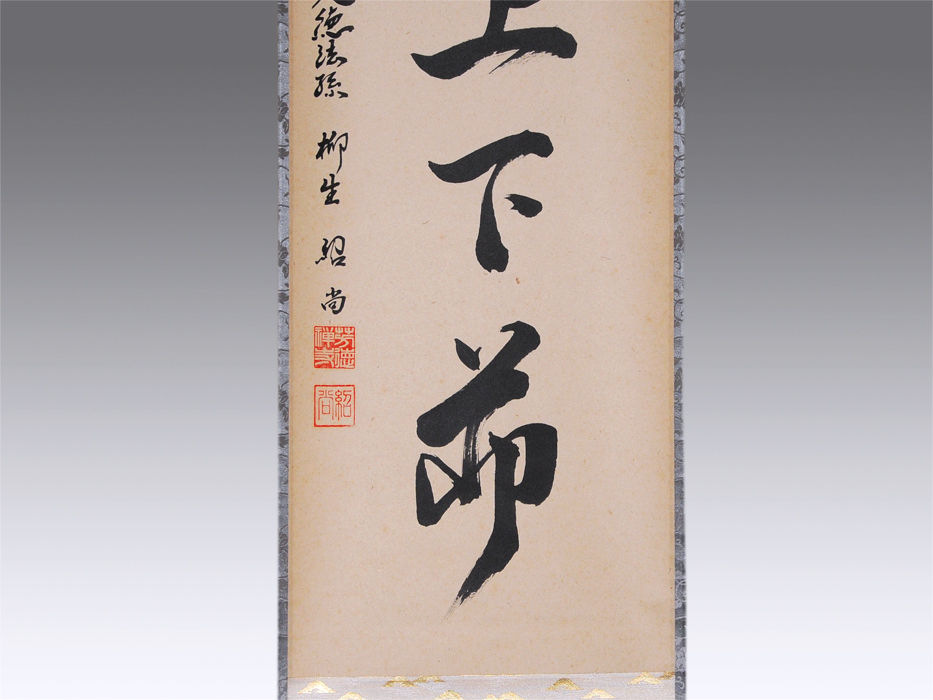 【真作】茶掛 橋本紹尚 直筆一行書「竹有上下節」です。 「竹有上下節」は松無古今色 竹有上下節(松に古今の色なく、竹に上下の節あり) 「松無古今色」とは松が春夏秋冬を通じ、枯れることなく青々と変わらぬものであるという意味。 「竹有上下節」とは真っすぐに伸びた竹には上下の節があるという意味。 古今と上下を並べ対比させた句で、差別即平等、平等即差別の意が込められている。 松と竹、ともに一年を通じて青々とした緑を有する植物で、おめでたいしるしとして用いられています。 表具は一文字、遠山金襴 中回し牡丹唐草緞子の上等な表具です。 シミ、折れ無く良い状態です。 ※撮影の際に生じた写り込みなどがございます。 ご理解の程よろしくお願い致します。 |