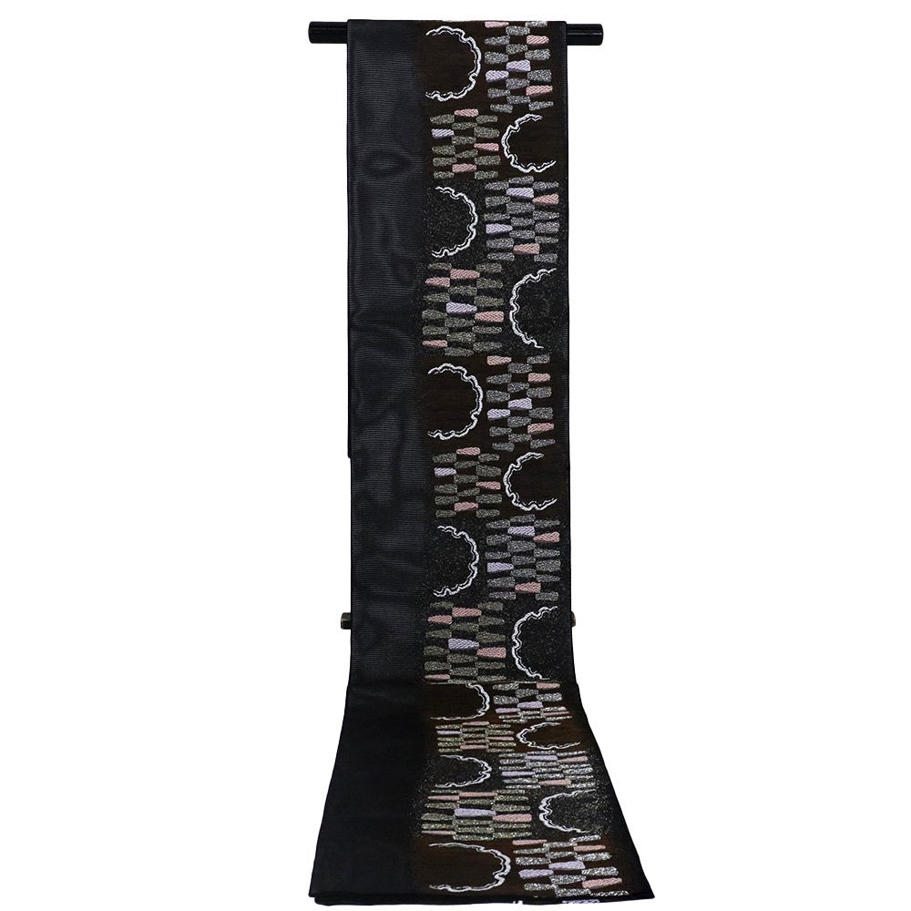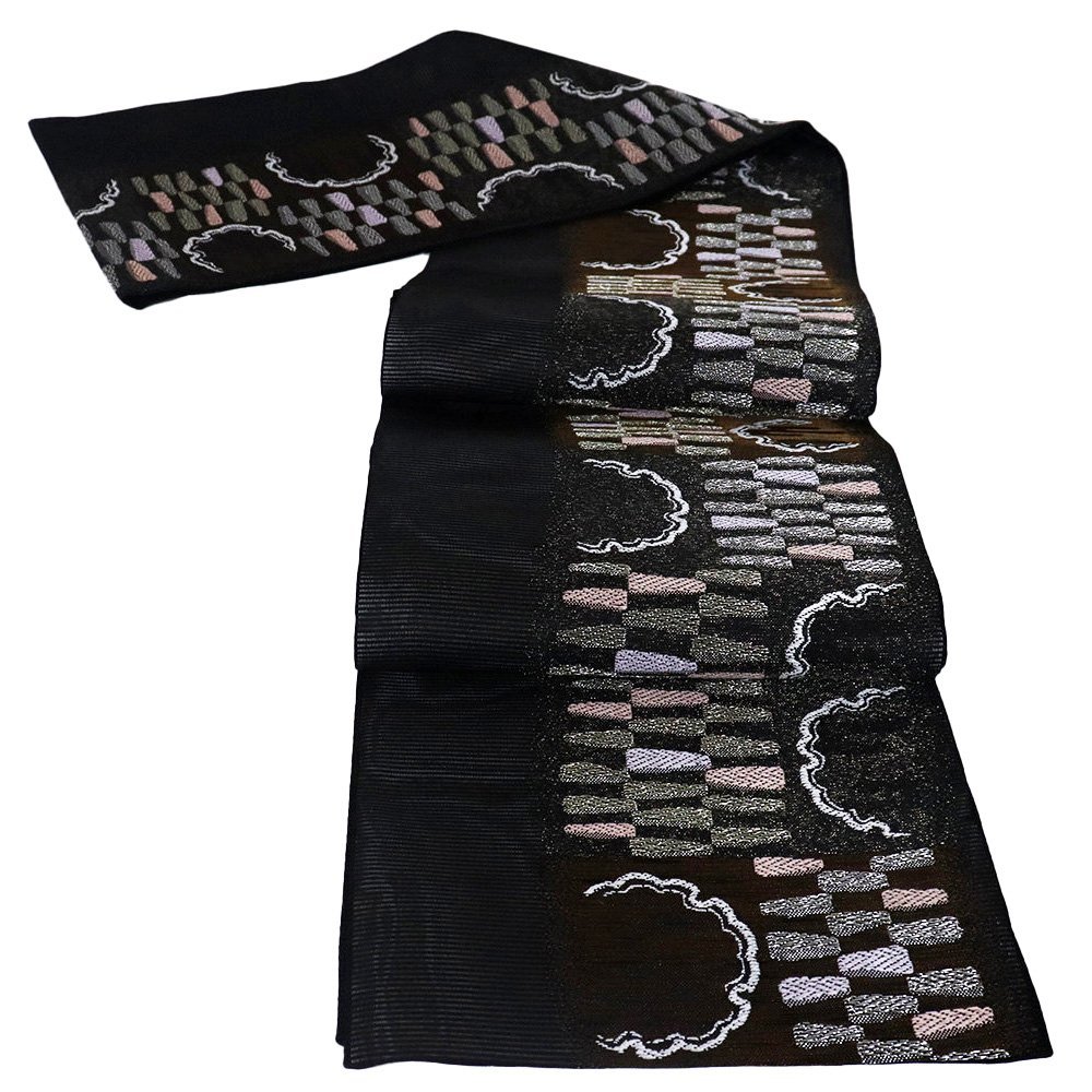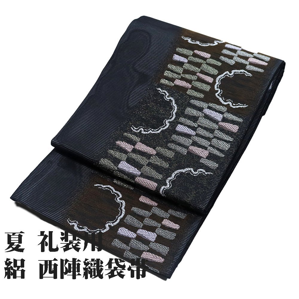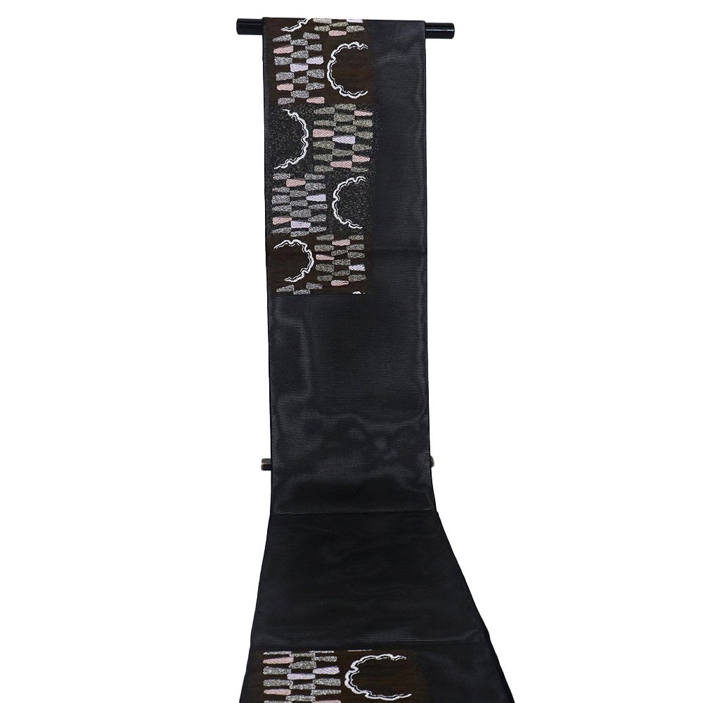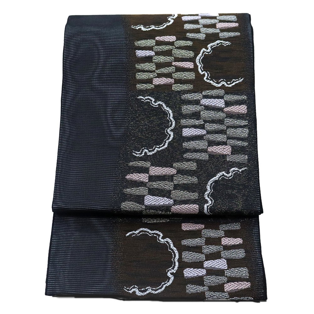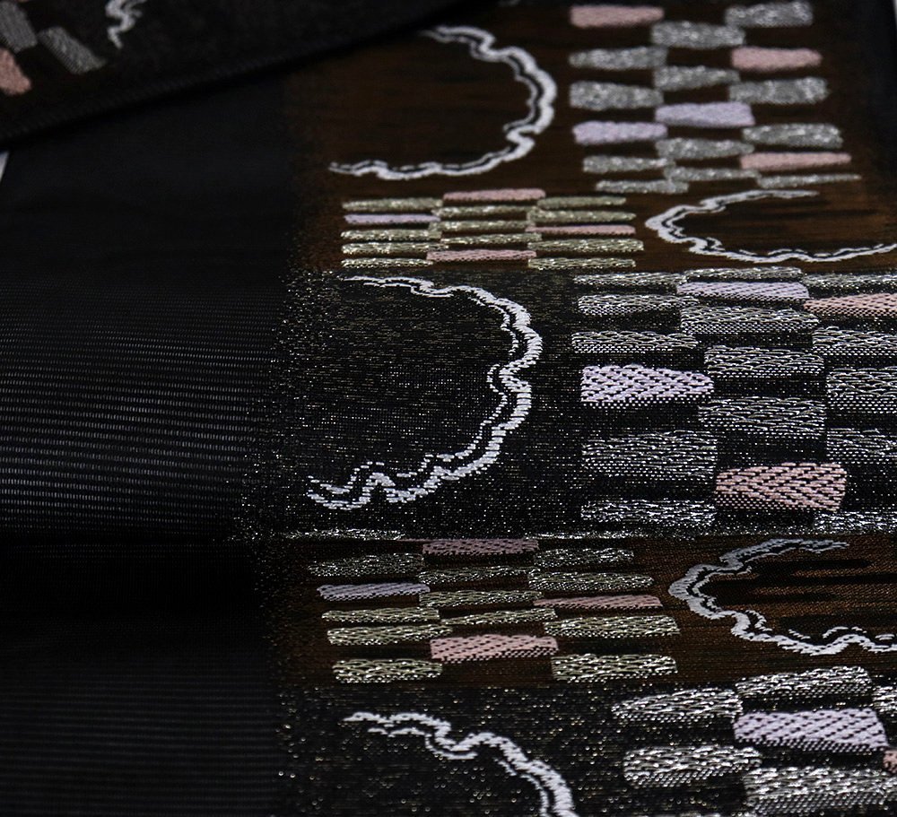 | (株)沢本織物謹製 絽 西陣織袋帯 黒・金・茶地 縫い取り小縞・雪輪文 新品 仕立て上がり | |