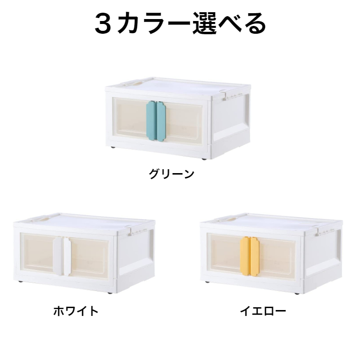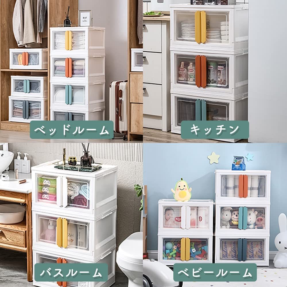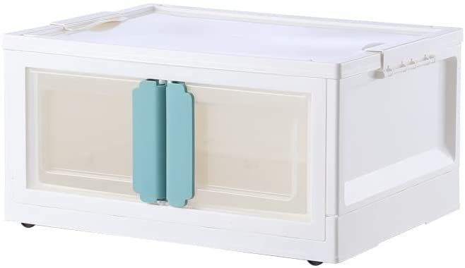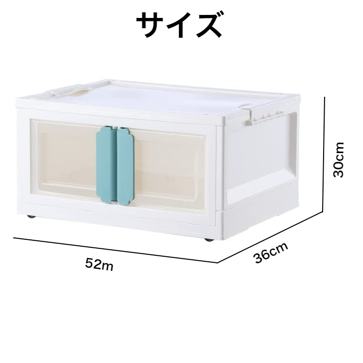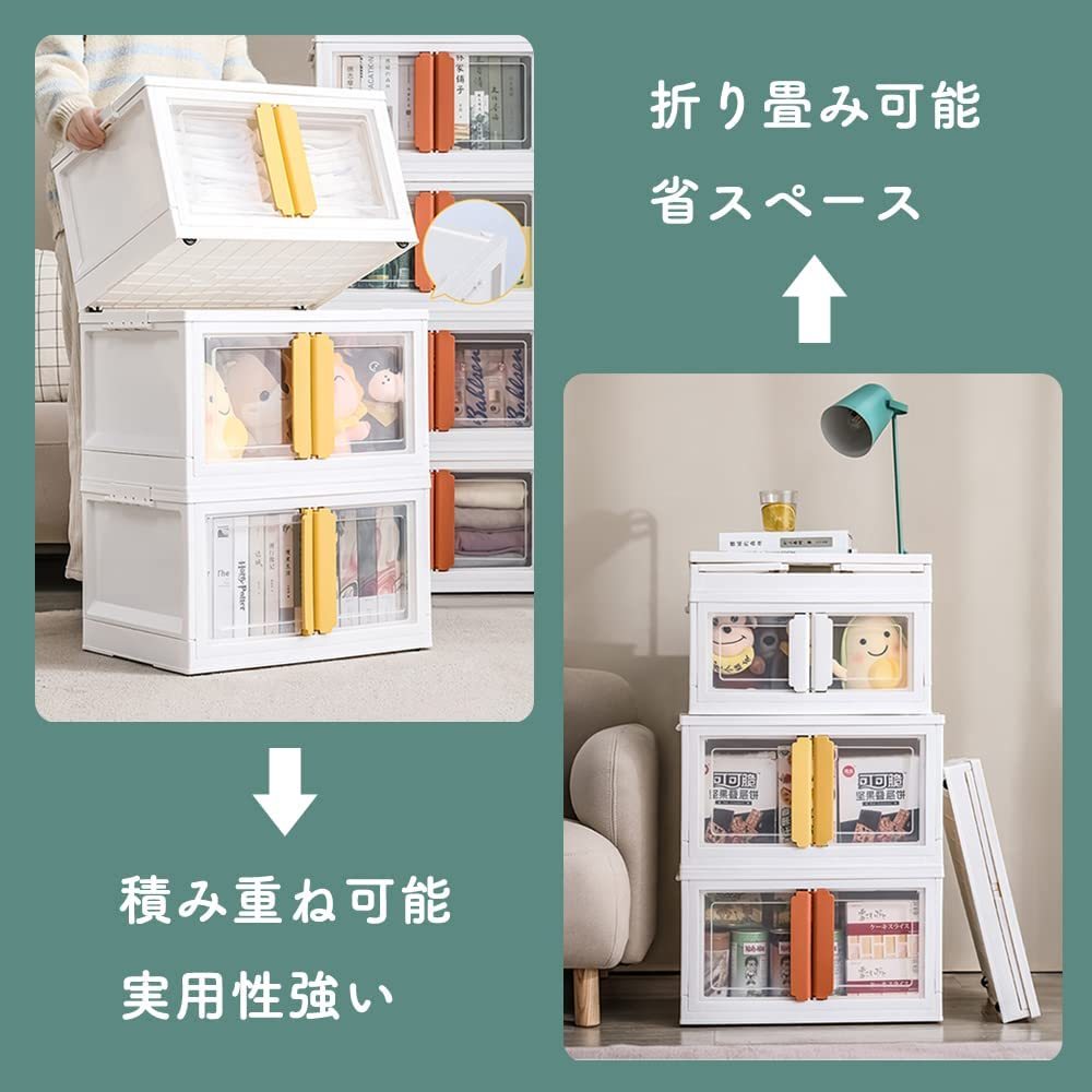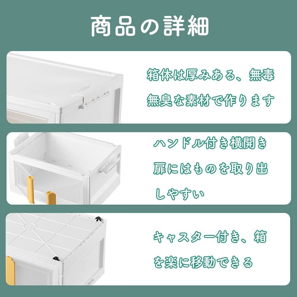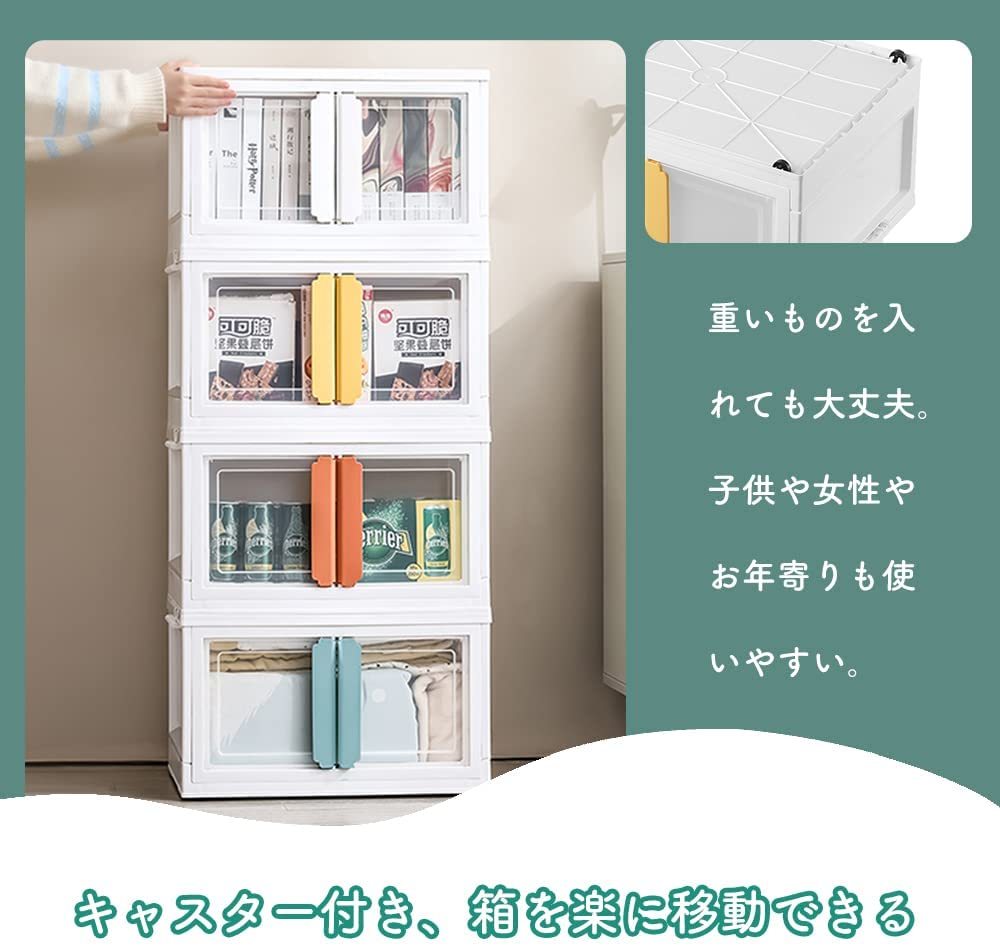 この収納ボックスは折り畳みが可能で、使えない時には折りたたんで隙間に置けます。スペースを取りません。外出にも使えます。【取っ手扉付き キャスター付き】収納ケースの正面は扉が付き、前からも上からも開けられ、蓋を開かなくても物を正面扉から楽に取り出せます。それに扉に取っ手が付き、開くときに使いやすい。日常生活の使用にとても便利です。底にはキャスターが付いていて、箱が重くても簡単に移動できます。【積み重ね可能 ?折りたたみ】省スペース性 実用性、この収納ボックスは積み重ねる可能です。戸棚、クローゼットに置けて、積み重ねて戸棚、クローゼットとしても使えます。物も取りやすいです。う時は開き、使わない時は5.5センチぐらいの厚さに折り畳めます。【組み立て簡単】一人で1分間ほどで組み立てられます。