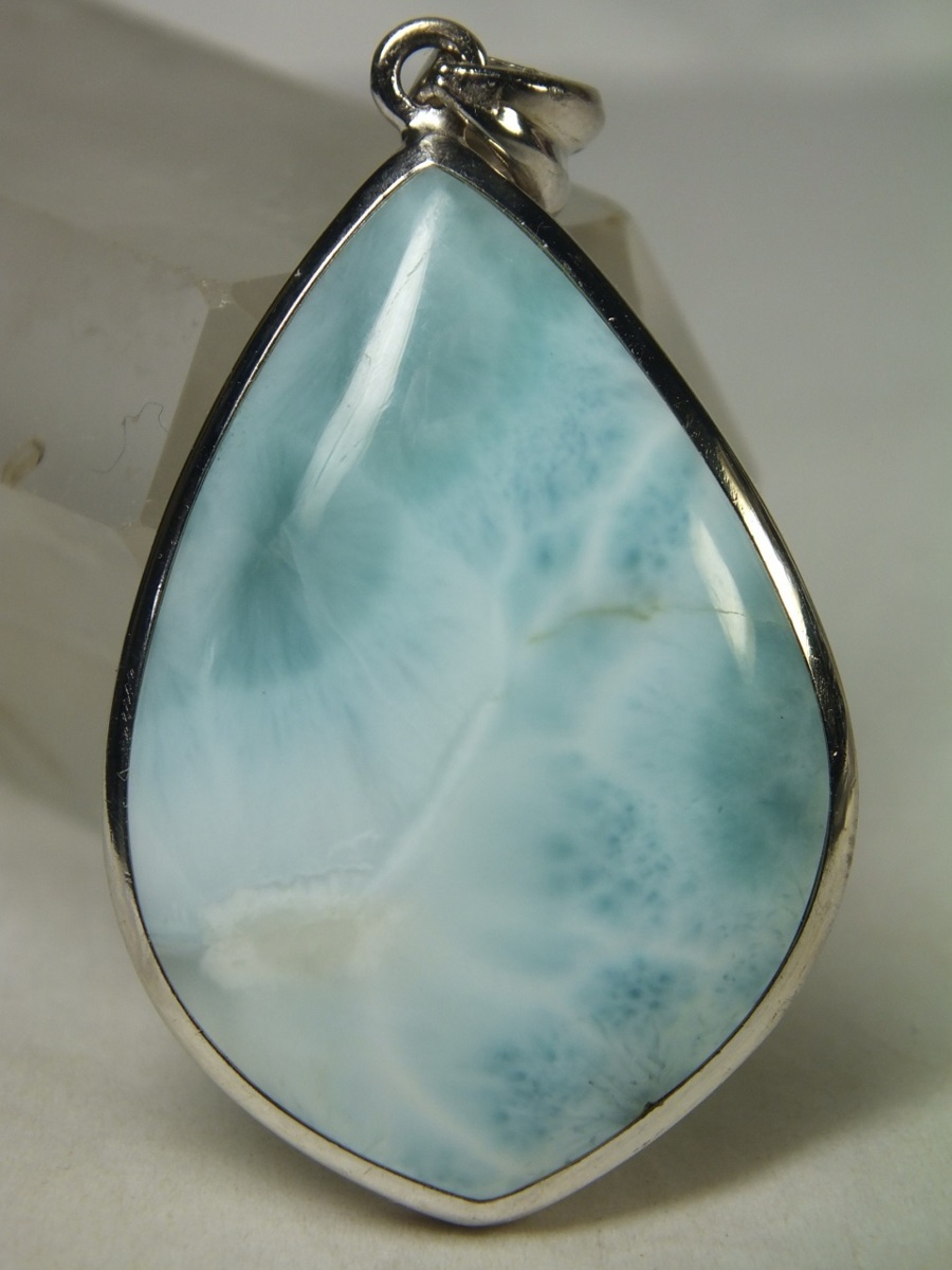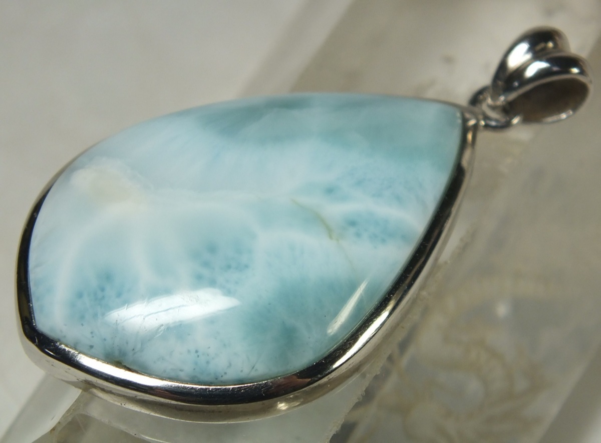 ▲商品説明▲ | サイズ(カン以下金具込み):40×28×厚7mm 重さ:16.3g その色から、大海の波間と浮雲を連想させるラリマー。チェーン等を通せば直ぐに御使用出来ます。金具は925銀製です。 ●ラリマーは、ドミニカ共和国でのみ産出される大変希少価値の高い鉱石のひとつで、ペクトライト(曹灰針石・そうかいしんせき)の事です。激しく高ぶった感情をなだめ、深い心の傷を癒すのに理想的な石とされています。 |