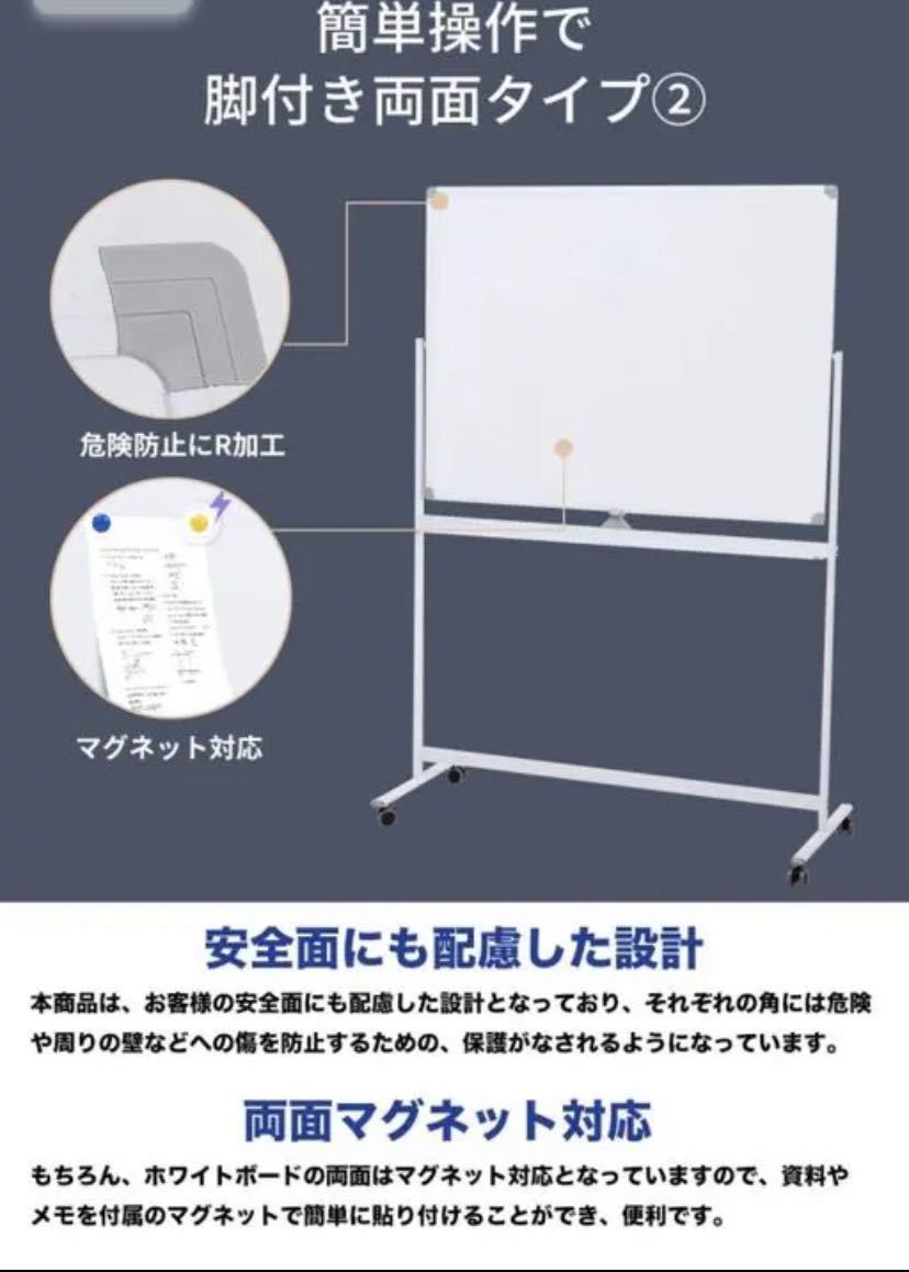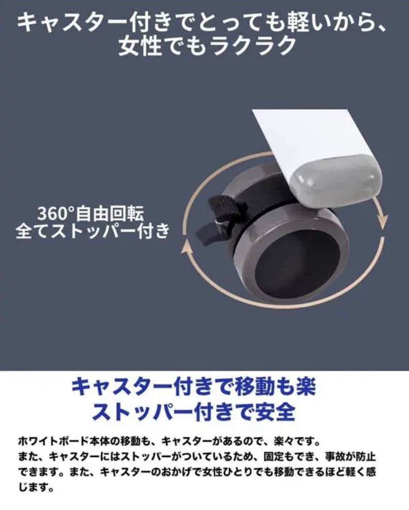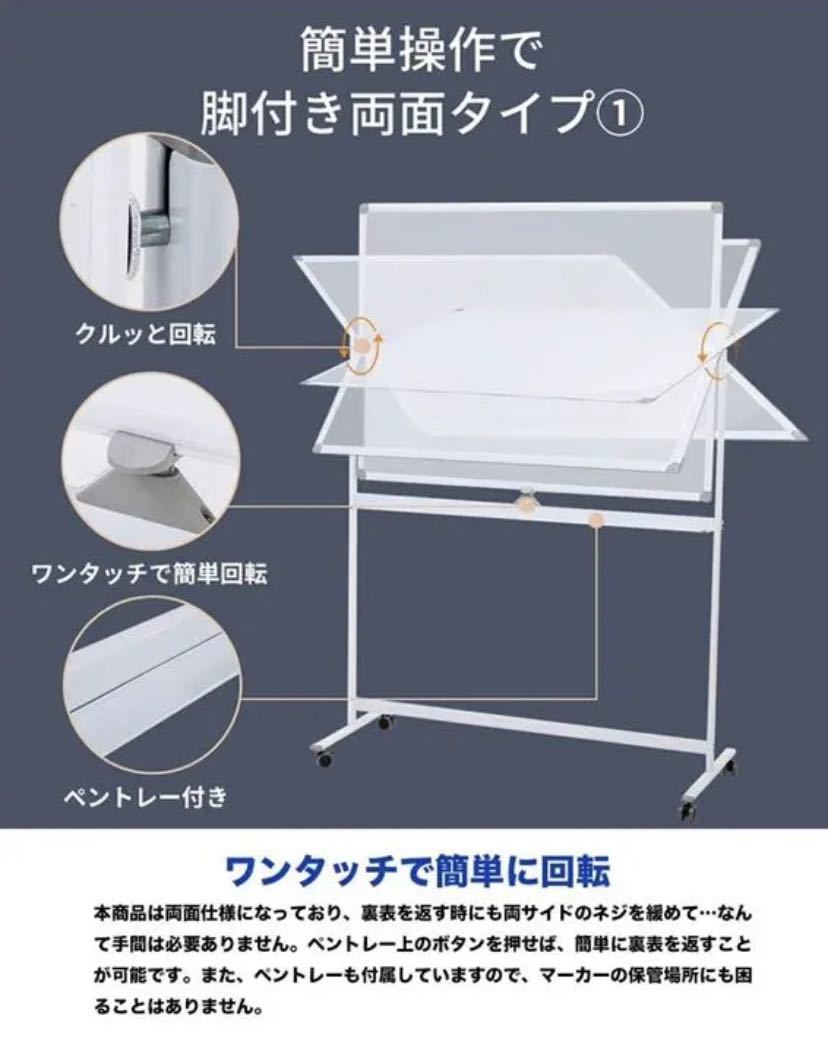 両面タイプはセンターストッパーを押し下げることで、板面が回転できるようになる仕様です。簡単操作で表も裏も使えます。プッシュ式のストッパーですので、簡単にホワイトボードを回転、楽に止められます。