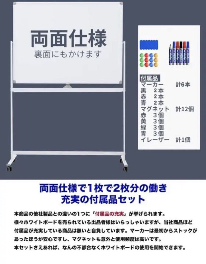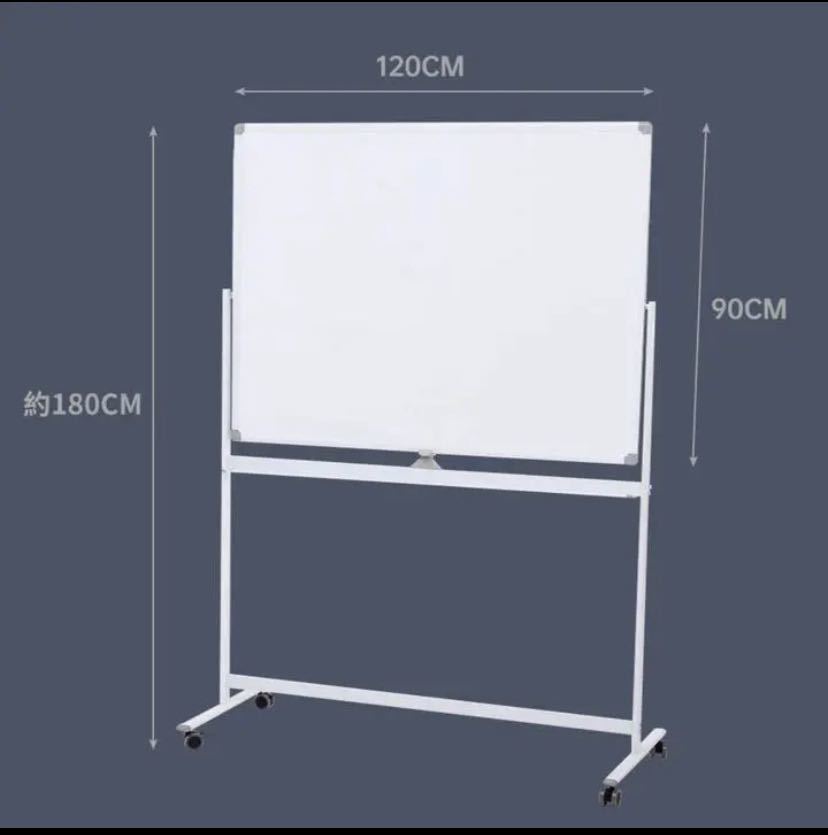 【商品について】 品名:両面T字脚付きホワイトボード120(無地) 材質:【板面】スチール 【フレーム】アルミ【脚】スチール、ナイロンキャスター 商品重量:14.3kg 梱包重量:16.25kg 備考:ペントレー付き ボードマーカー(黒、赤、各1本)とイレーサー(ボード拭き)1個付き