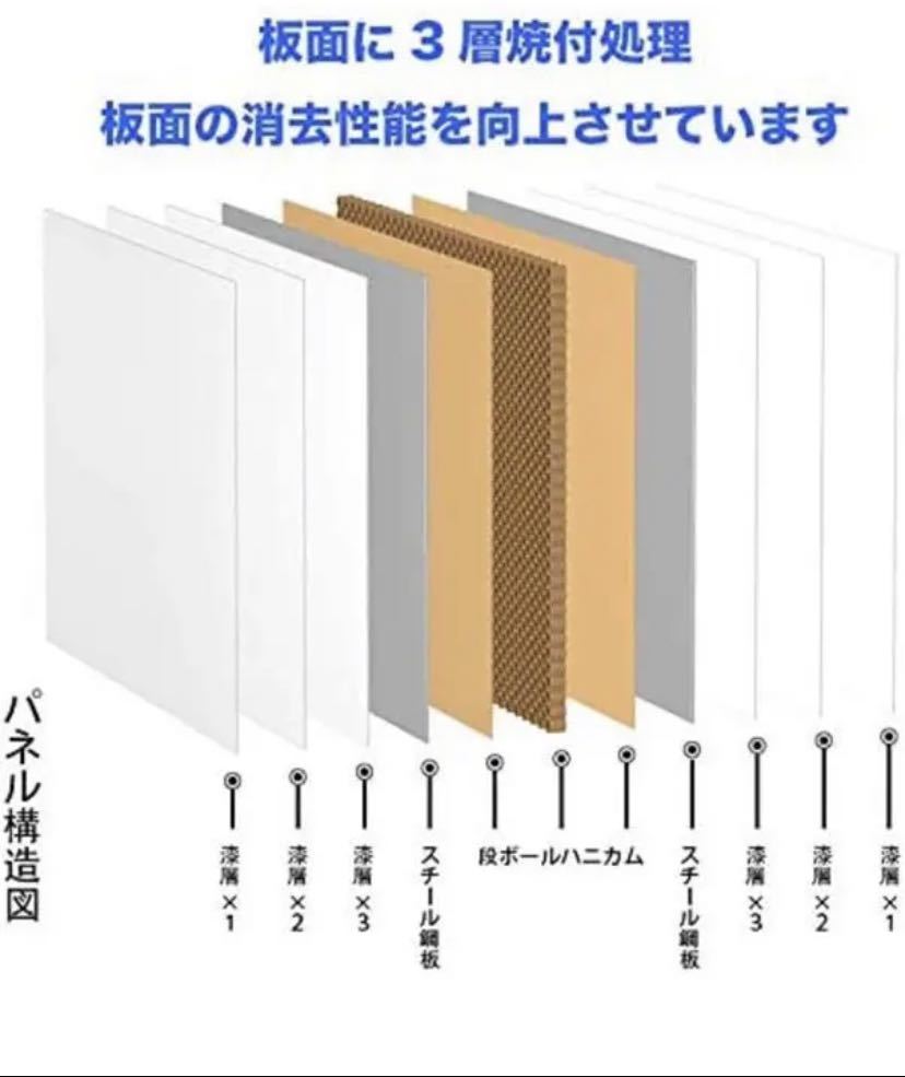 特殊鋼板にニッケル処理を施し、表面をホーローで仕上げてます。錆やアルコール、ひっかき傷などに強く、耐久性に優れています。ガラスコーティングされた表面は平滑性が高いため、文字が鮮明で見えやすく、マーカーの書き味も滑らかです
