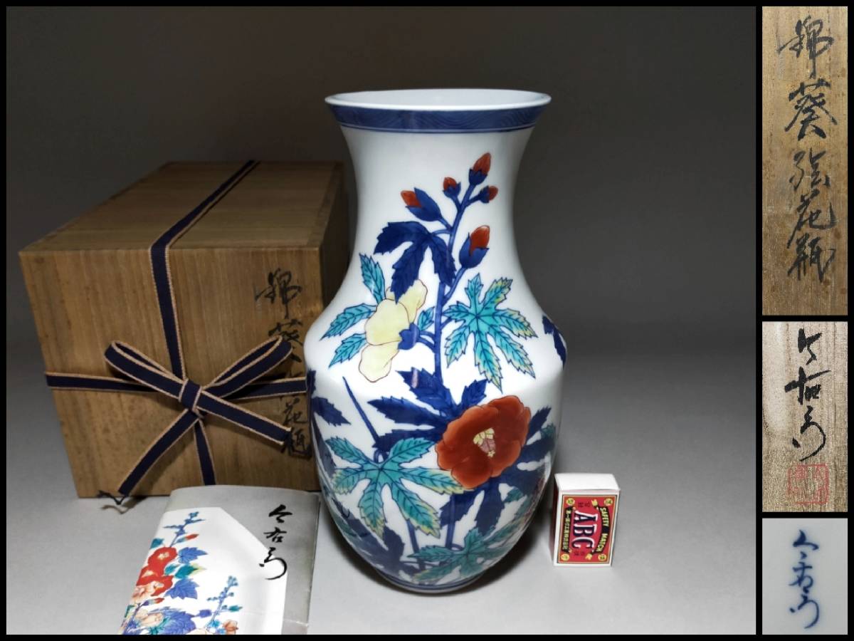 瓶 十二代 今泉今右衛門 錦葵絵花瓶 高27.8㎝ 栞・共箱付