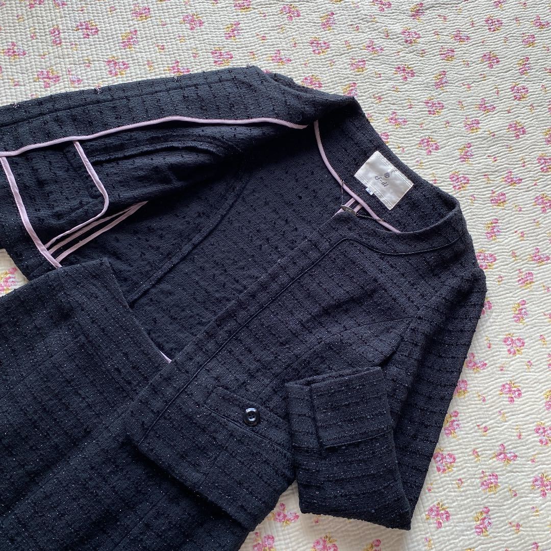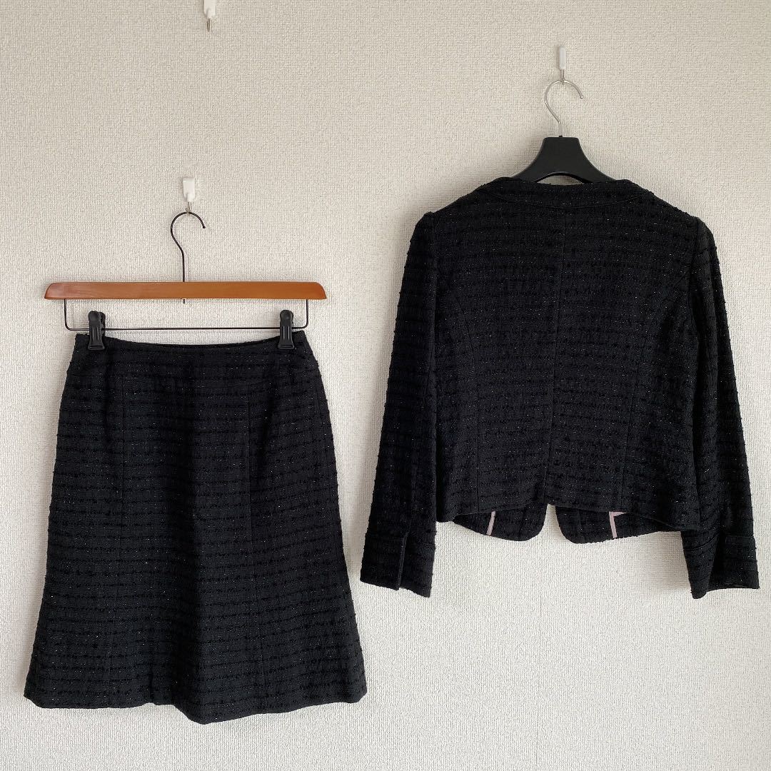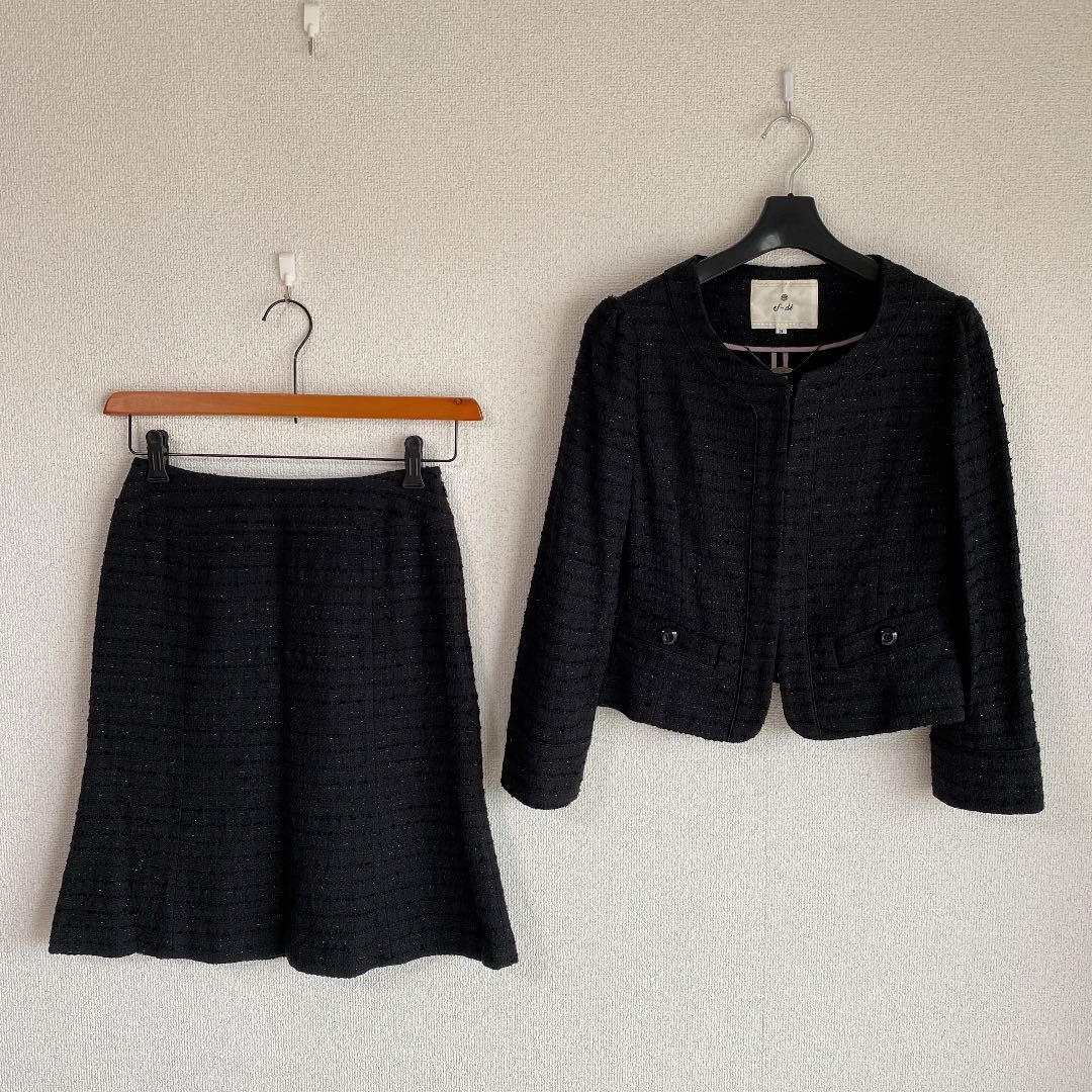 ご覧いただきありがとうございます。染み、汚れ、ほつれのない、【新品同様】の、自信を持ってお勧めできる、良いお品を提供致しております。【極美】ノーカラー ママスーツ エフデ 9 W62 黒 ラメ 入学入園 セレモニーDMW でございます。ef-de エフデ フランドルのお品です。エフデの【新品】セットアップをお買い上げ予定の方にお勧めできる、上質スーツです。上品で、清楚な雰囲気で着こなせます。面接、ビジネス、学校行事にお勧めです。お色は画像でご確認下さい。画像に良くお色が出ています。黒ラメ入りです。背抜き仕立て。フロントにホックが4つ付いています。袖口は、折り返して着ることもできるタイプです。ジャケット、外ポケット×2。スカート、左サイドファスナー、ポケット×0。スリットなし。脇染み、汚れ、ほつれのない【極美】、とてもきれいなスカートスーツです。 卒業卒園。