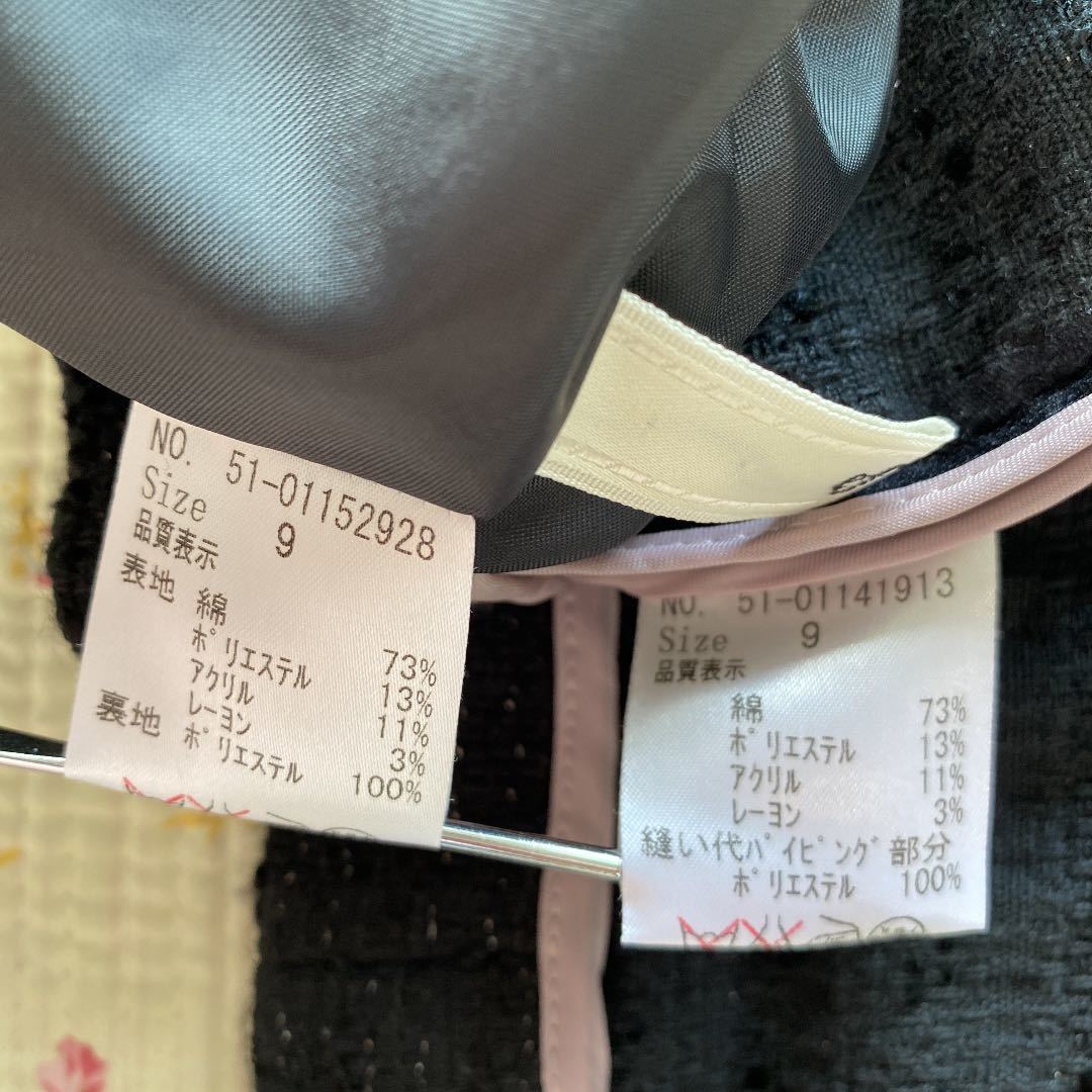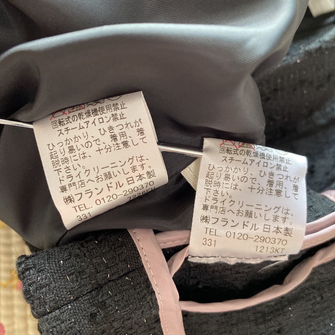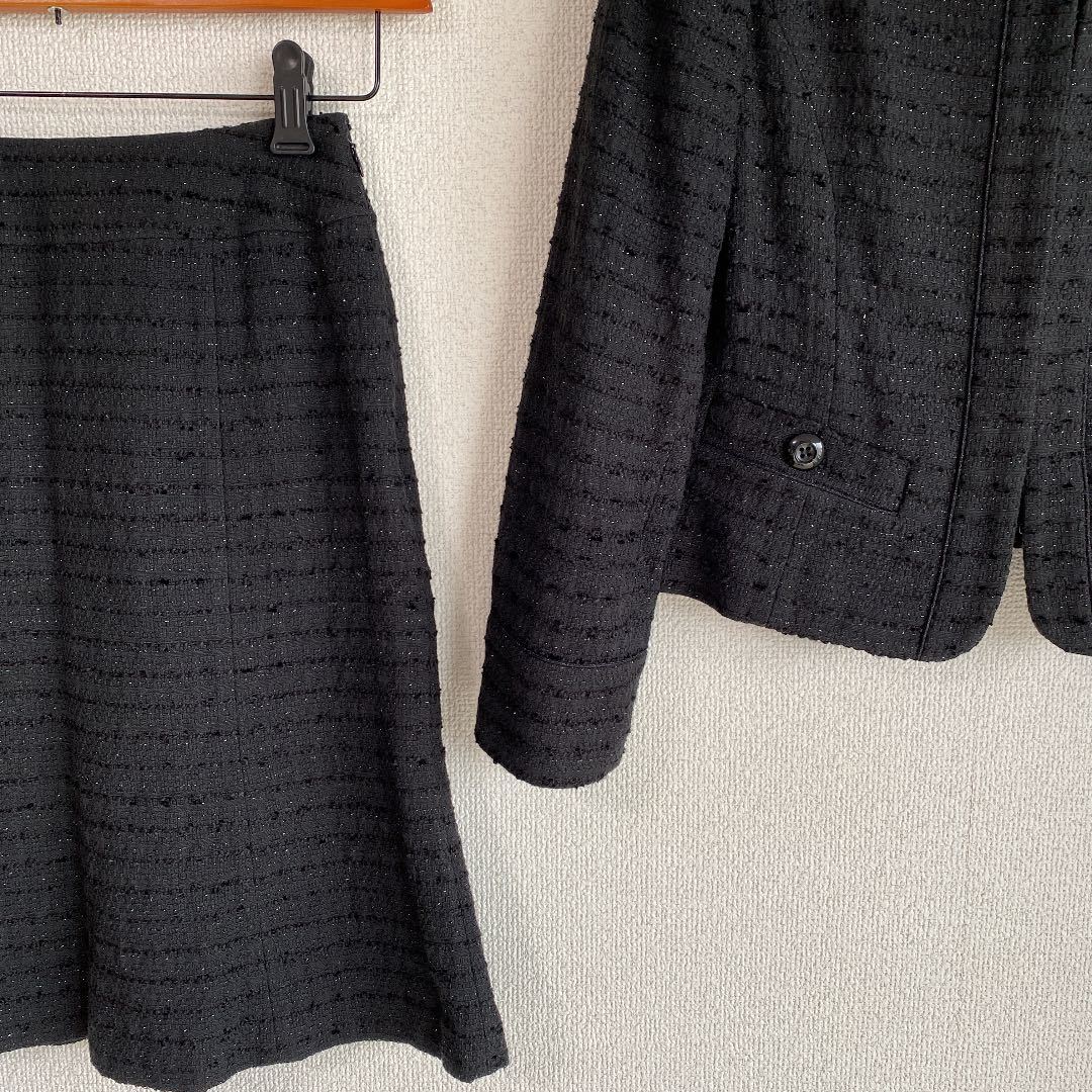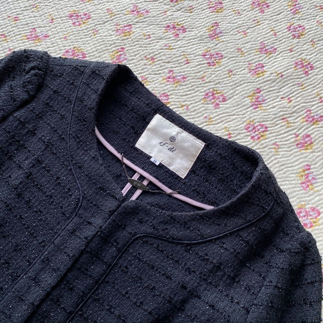 ご覧いただきありがとうございます。染み、汚れ、ほつれのない、【新品同様】の、自信を持ってお勧めできる、良いお品を提供致しております。【極美】ノーカラー ママスーツ エフデ 9 W62 黒 ラメ 入学入園 セレモニーDMW でございます。ef-de エフデ フランドルのお品です。エフデの【新品】セットアップをお買い上げ予定の方にお勧めできる、上質スーツです。上品で、清楚な雰囲気で着こなせます。面接、ビジネス、学校行事にお勧めです。お色は画像でご確認下さい。画像に良くお色が出ています。黒ラメ入りです。背抜き仕立て。フロントにホックが4つ付いています。袖口は、折り返して着ることもできるタイプです。ジャケット、外ポケット×2。スカート、左サイドファスナー、ポケット×0。スリットなし。脇染み、汚れ、ほつれのない【極美】、とてもきれいなスカートスーツです。 卒業卒園。