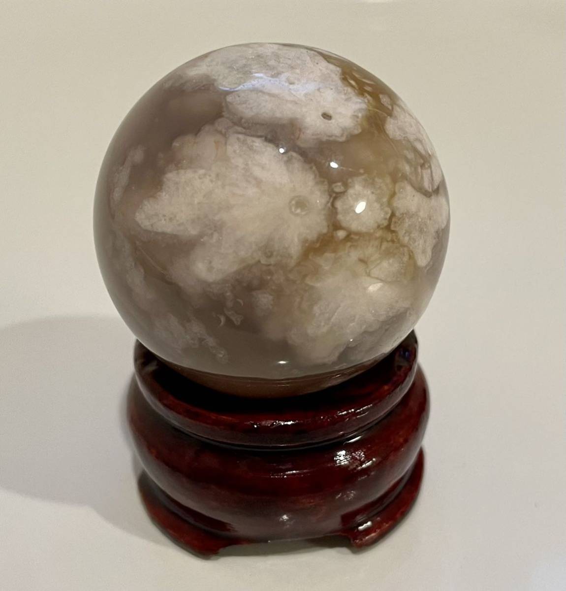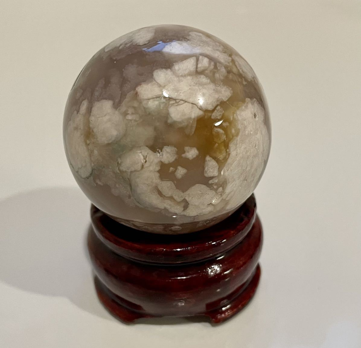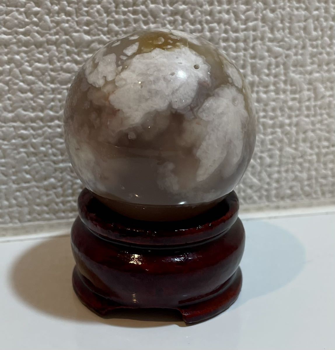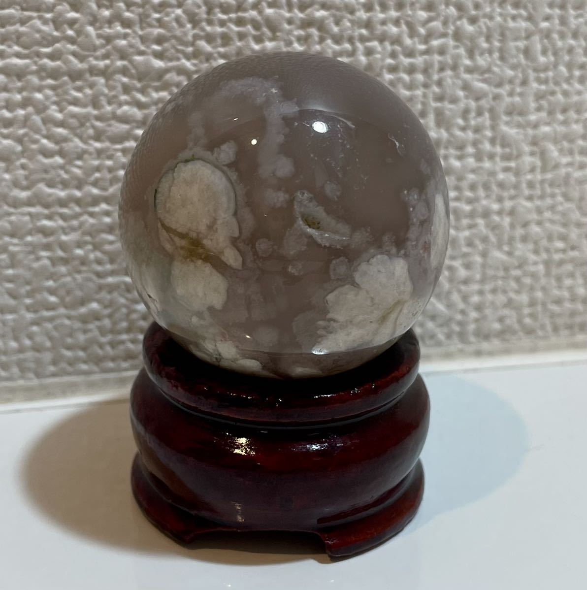 桜アゲート フラワーメノウ 瑪瑙 スフィア 丸玉 天然石 置物インテリア 風水晶 小物ファッション ゴールド 水晶 原石 台座付