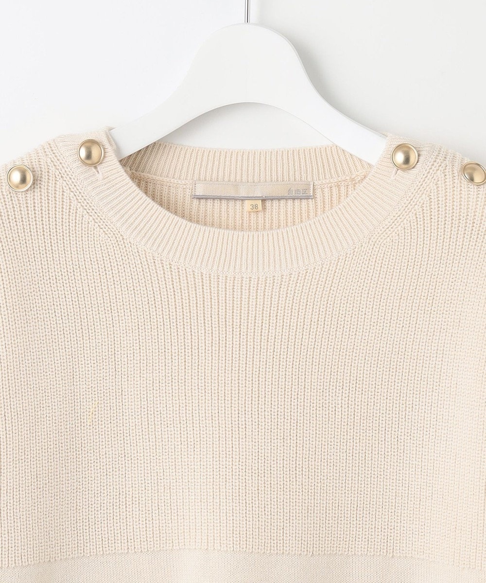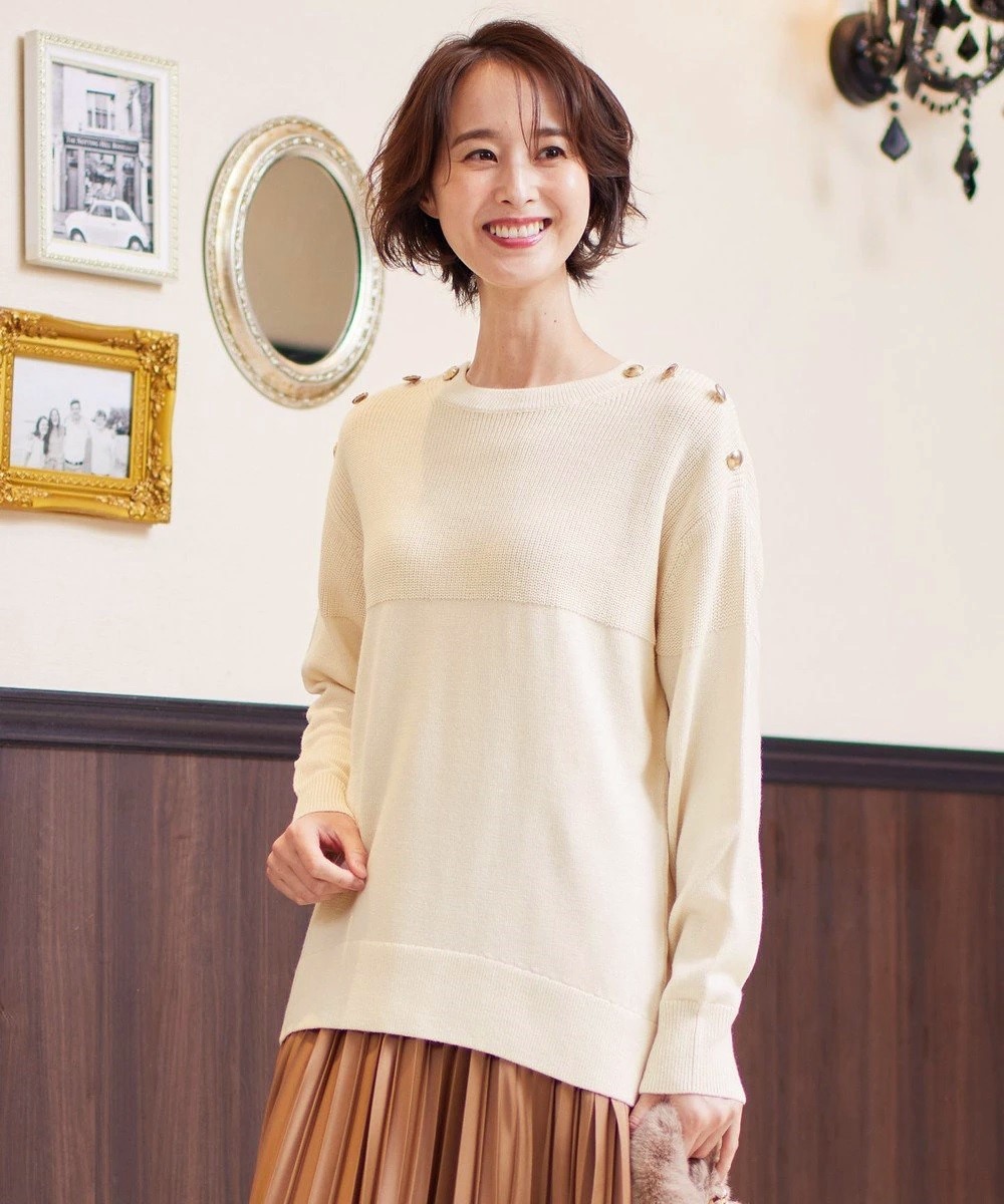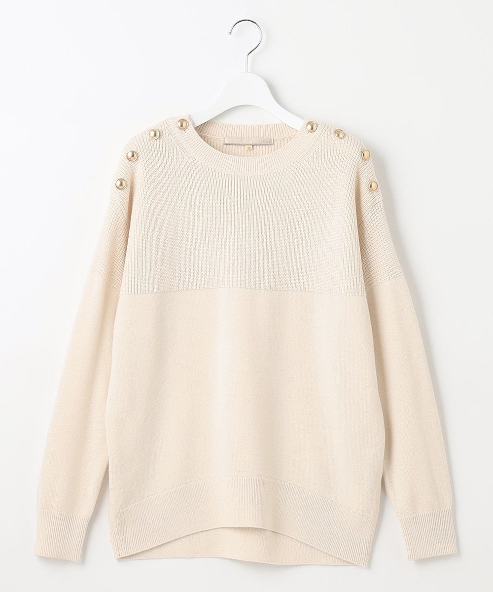 肩部分にあしらった、フレンチマリン風の大きめなメタル釦がアクセントになったニット。