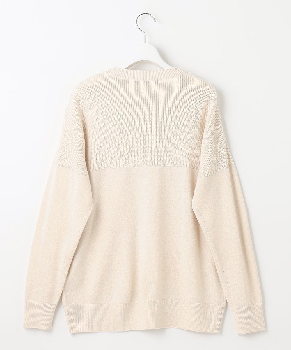 畦編みと天竺編みのコンビネーションで編み方に変化を付けた、ややマニッシュな印象のデザインですが、ゆったりめのリラックスしたシルエットで女性らしく着て頂けます。