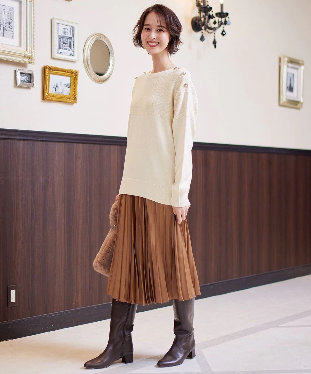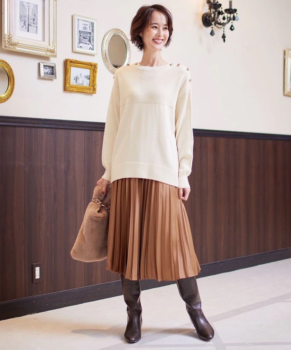 スカートにもパンツにも合わせやすいので、デイリーに取り入れやすいアイテムです。