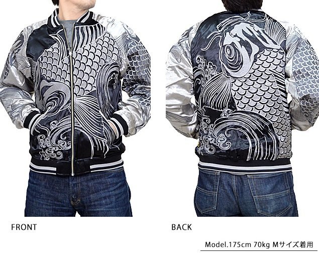 絡繰魂さんから「巨大鯉爆翔スカジャン(224055)」のご紹介です。 重みを感じる程の刺繍量が魅力的な絡繰魂から、最新作のスカジャンが登場しました。 今回モチーフの主役に採用されたのは、定番の鯉。 表面はしっかり柄の入ったスカジャンですが、対象的に裏面はシンプルに仕上げ、メリハリを付けました。 ボディーにはレーヨンサテンを使用し、ドレープや陰影がくっきりと現れています。 | ||||||||||||||||||||