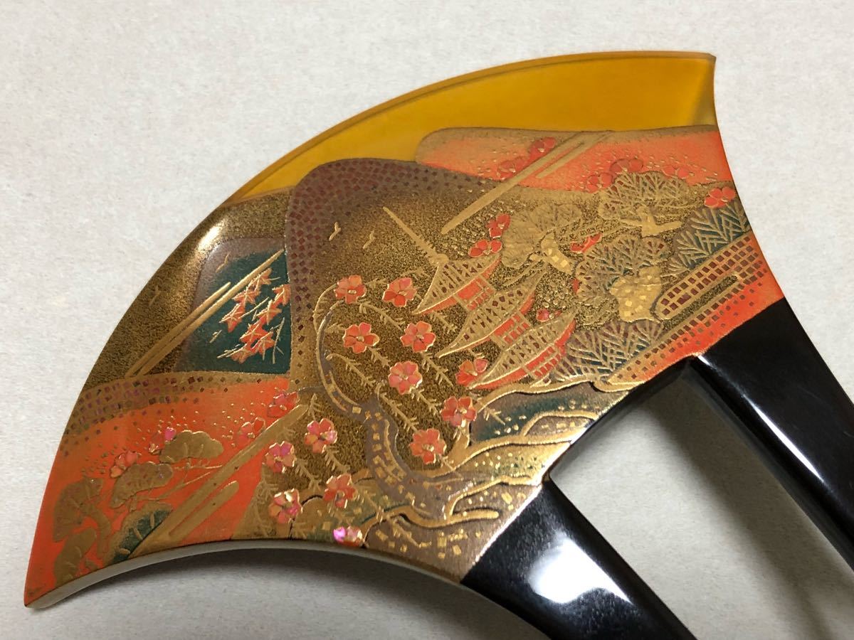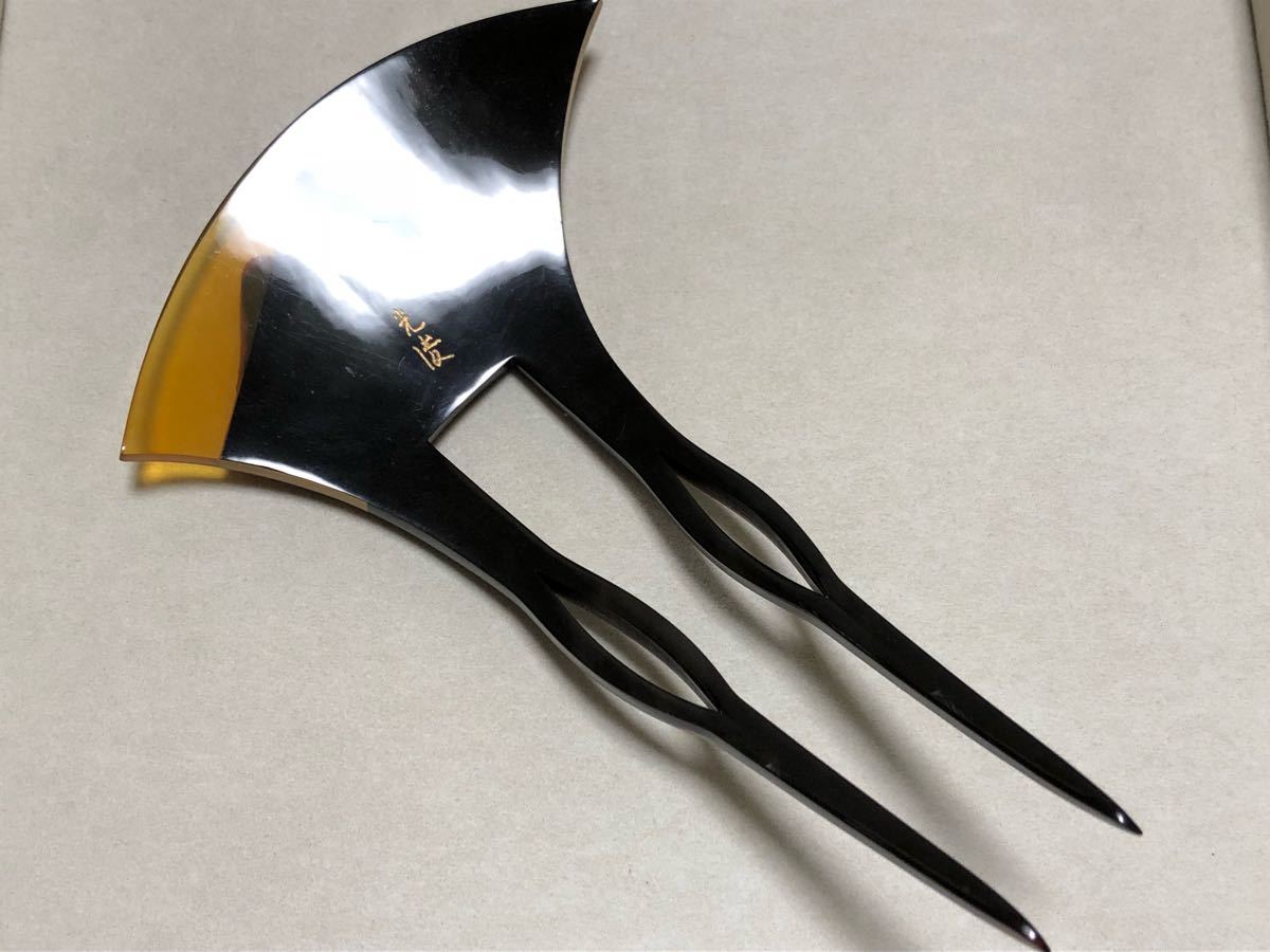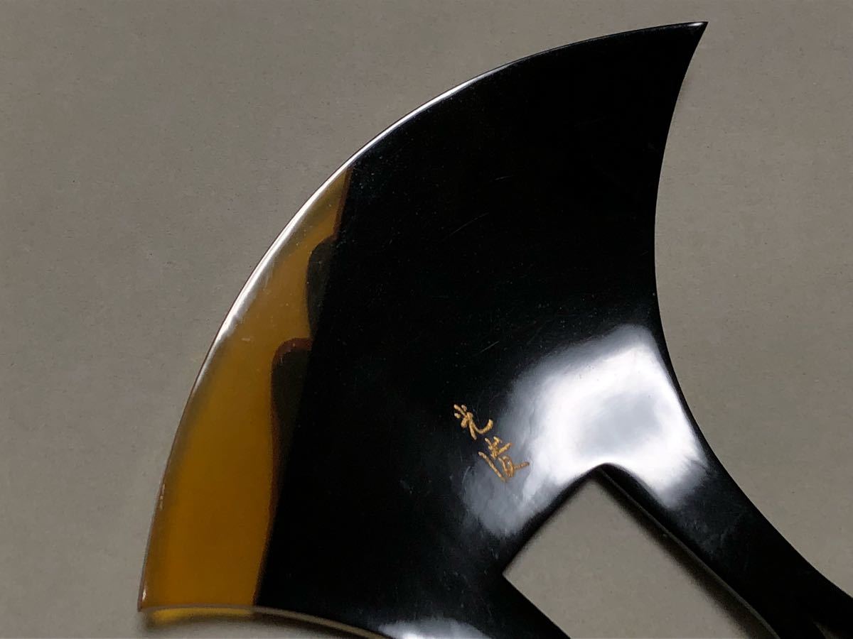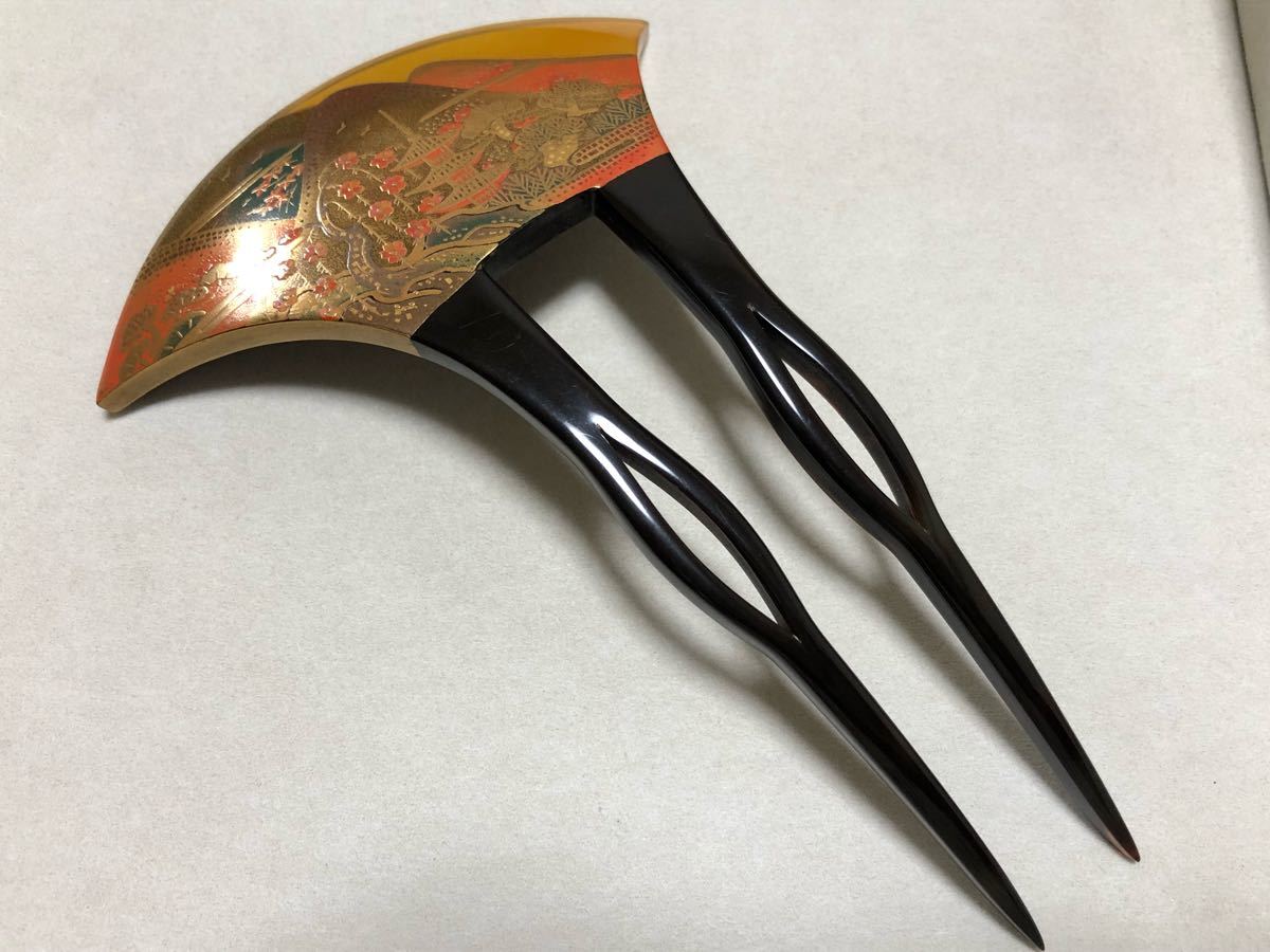 アンティークの白甲、黒甲の本鼈甲を使用し、金蒔絵、螺鈿を施した、秋山景三重塔図の扇簪です。作者、光俊の銘があります。鼈甲部分に欠けや虫食いはありません。 長さ13.5cm、幅8.2cm、重さ17.7g