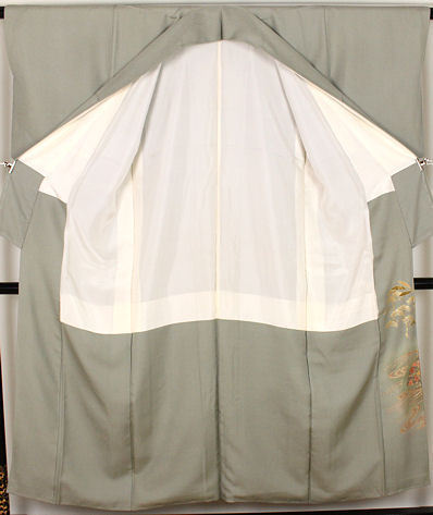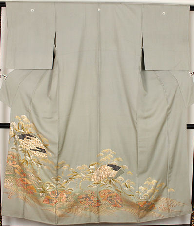 | 色留袖 袷 丹後縮緬地 薄緑地扇紋 松竹梅・鳳凰・橘 160 広襟 三つ紋 |