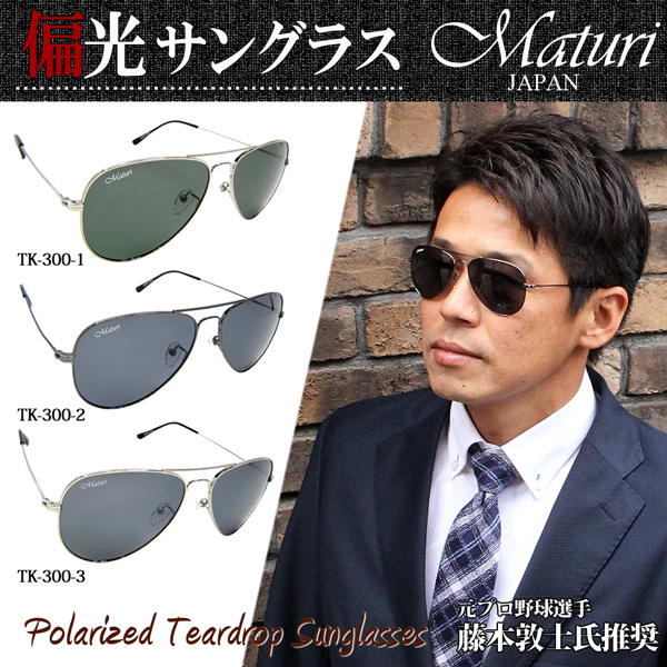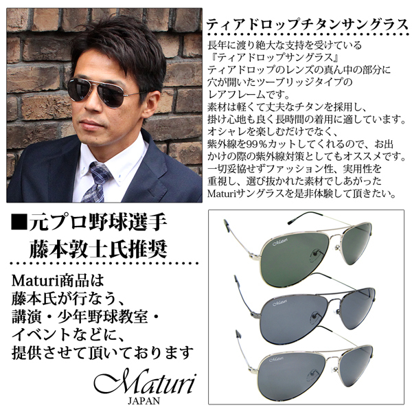 元プロ野球選手、藤本敦士氏推奨ブランド ◆Maturi商品は藤本氏が行なう、講演・少年野球教室・イベントなどで、提供させて頂いております。 長年に渡り絶大な支持を受けている『ティアドロップサングラス』 ティアドロップのレンズの真ん中の部分に穴が開いたツーブリッジタイプのレアフレームです。 素材は軽くて丈夫なチタンを採用し、掛け心地も良く長時間の着用にも適しています。 どんなファッションにも合わせやすくユニセックスでお使い頂けるアイテムです。 オシャレを楽しむだけでなく、紫外線を99%カットしてくれるので、お出かけの際の紫外線対策としてもオススメです。 一切妥協せずファッション性、実用性を重視し、選び抜かれた素材でしあがったMaturiサングラスを是非体験して頂きたい。 【偏光レンズとは】 眩しさや反射光を、より効果的にカットできるレンズです。 偏光レンズは光量を抑え、反射光だけをカットし、より快適な視界を確保する機能が大きな特徴です。 マリンスポーツでは水面のギラツキを軽減し、水中まで見えやすくなります。 マラソン・釣り・ゴルフ・ツーリング・ウィンタースポーツなどに適しています。 下記よりカラーをお選び下さい。 (落札時、オーダーフォームにてご希望の型番をご連絡下さいませ。ご連絡を頂けない場合は当店で選択させて頂きます。) ■TK-300-1:レンズ/グリーン、テンプル/シルバー、可視光線透過率15% ■TK-300-2:レンズ/グレー、テンプル/ガンメタ、可視光線透過率15% ■TK-300-3:レンズ/グレーミラー、テンプル/シルバー、可視光線透過率10% ■サイズ:(約)レンズ横5.6cm×縦4.8cm、フレーム幅(外側)13.7cm (実寸につき誤差はあらかじめご了承ください) ■素材:レンズ(紫外線UVカット約99%)、フレーム/チタン ■紫外線透過率:1.0%以下 ■付属品:専用ケース ■新品・未使用 ■定価27,800円 ※一部画像共通 ※ご覧のモニターやプラウザの設定、照明等により、画像と実物の色合いが、若干異なる場合が御座います。 ※製造上の過程により商品によっては細かな傷がある場合が御座います予めご了承下さいませ。 | |