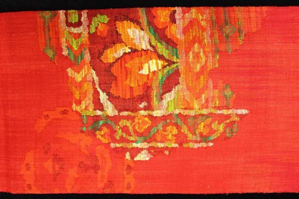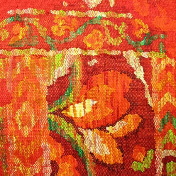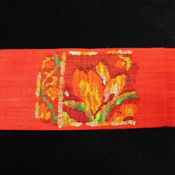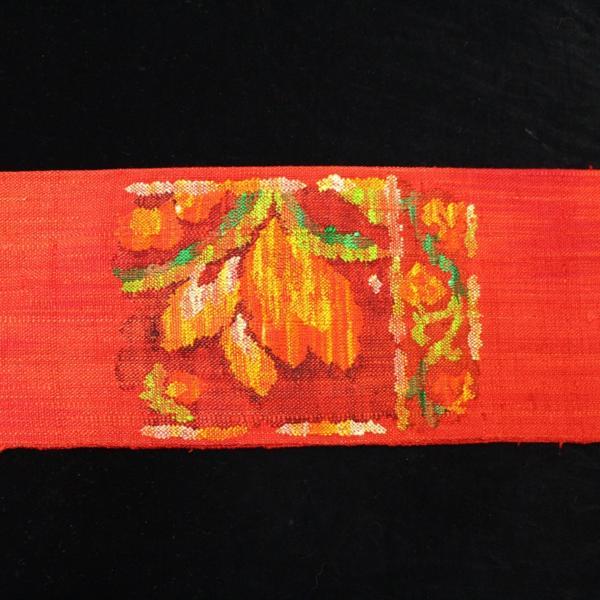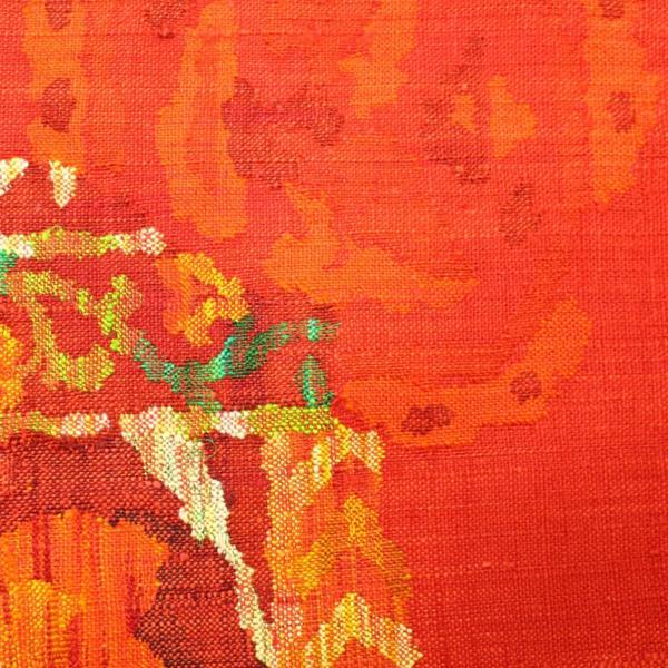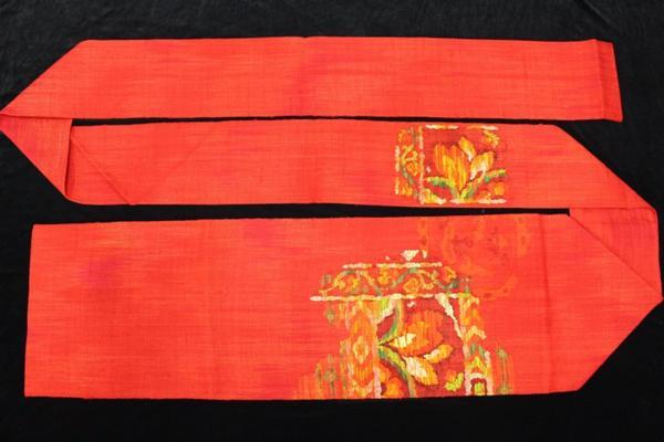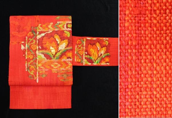 素材:正絹。幅約30.5cm、長さ約368cm。赤色系です。使用感ありません。