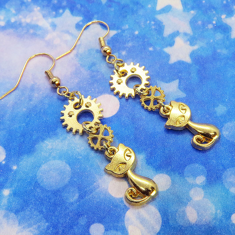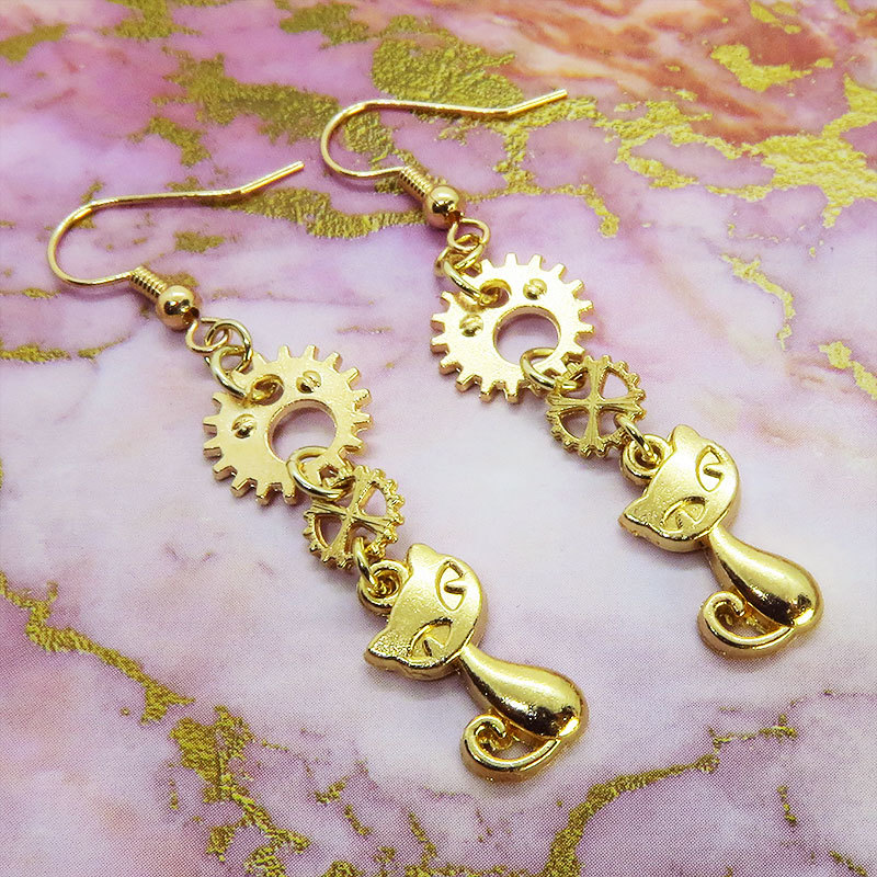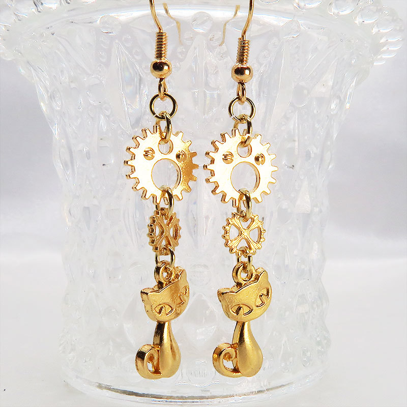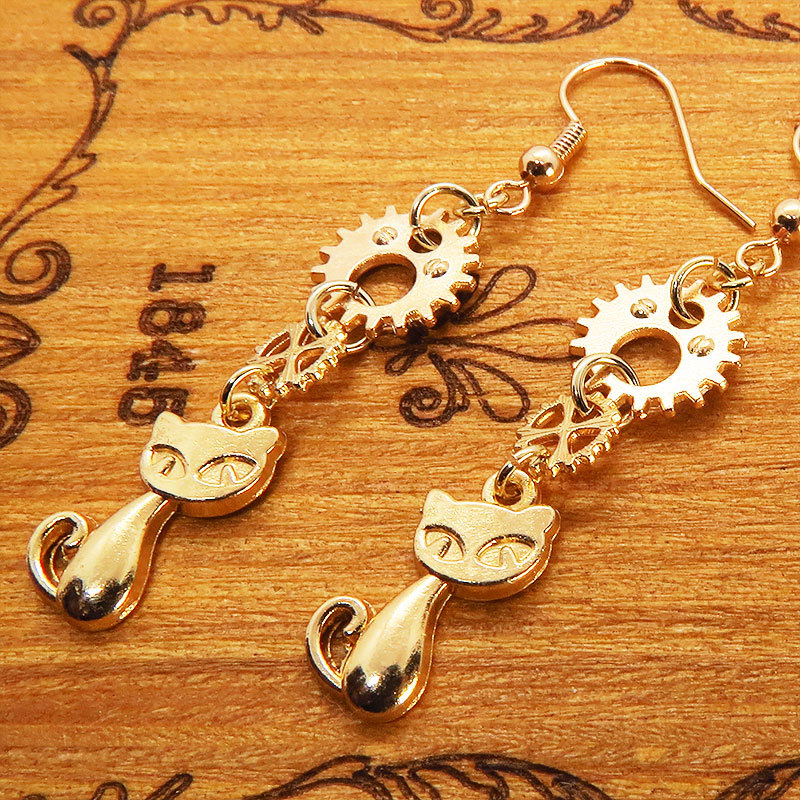 マットゴールド 猫と異なる大きさの歯車を組み合わせた大人可愛いピアス サージカル可