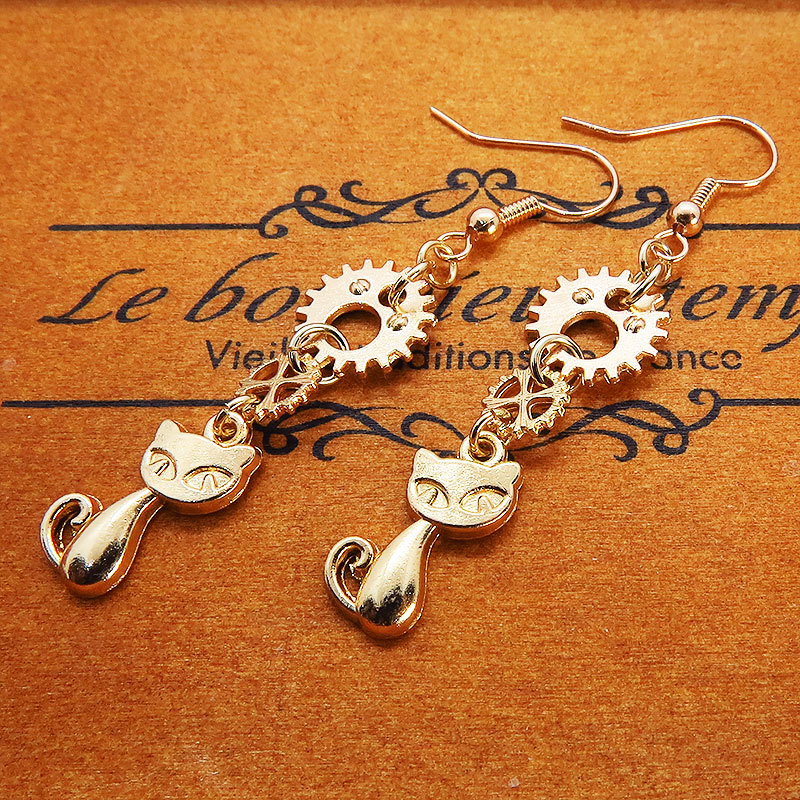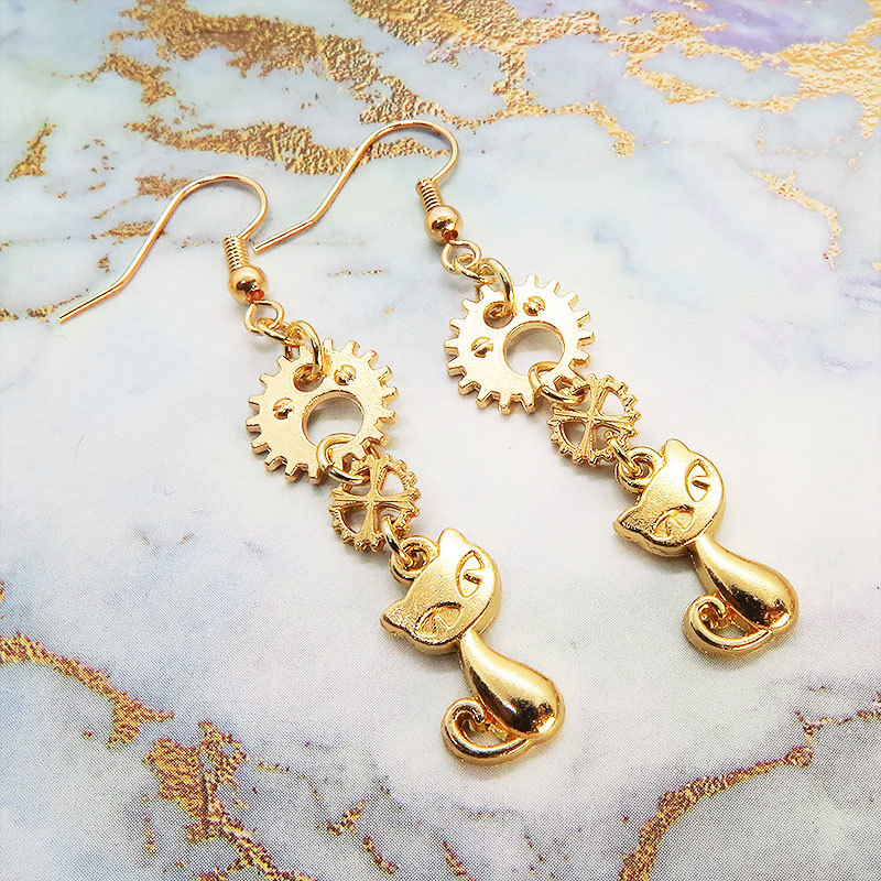 落ち着きのあるマットゴールドで統一した、猫と大小異なる大きさの歯車を組み合わせたピアスです