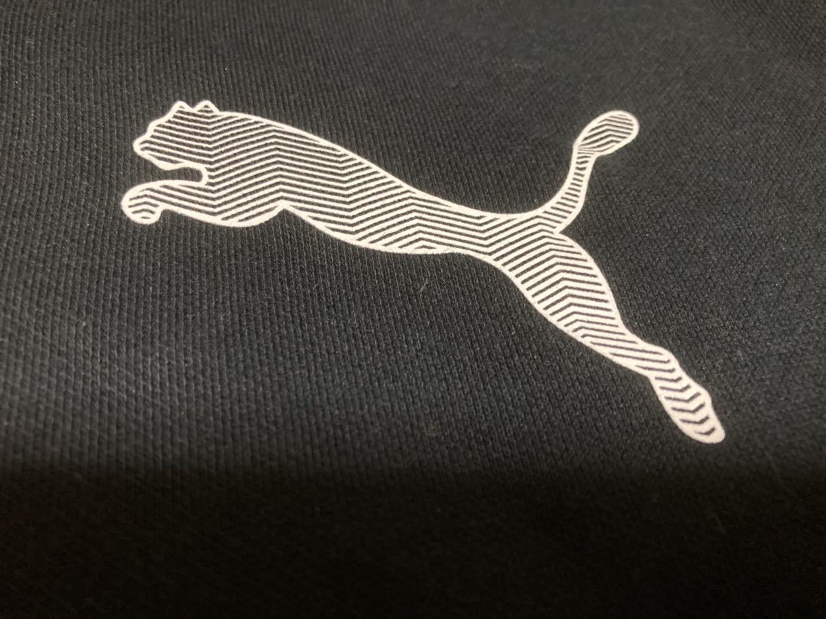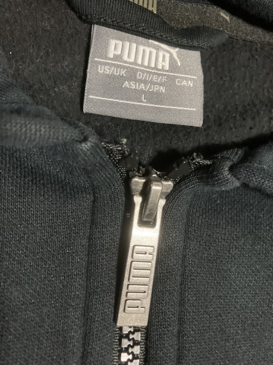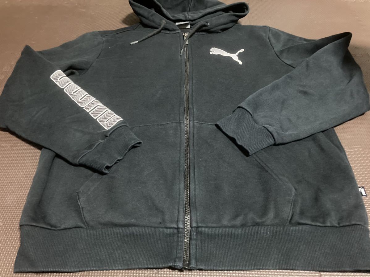 美品PUMA裏起毛、黒、ロゴ白ストレッチパーカ