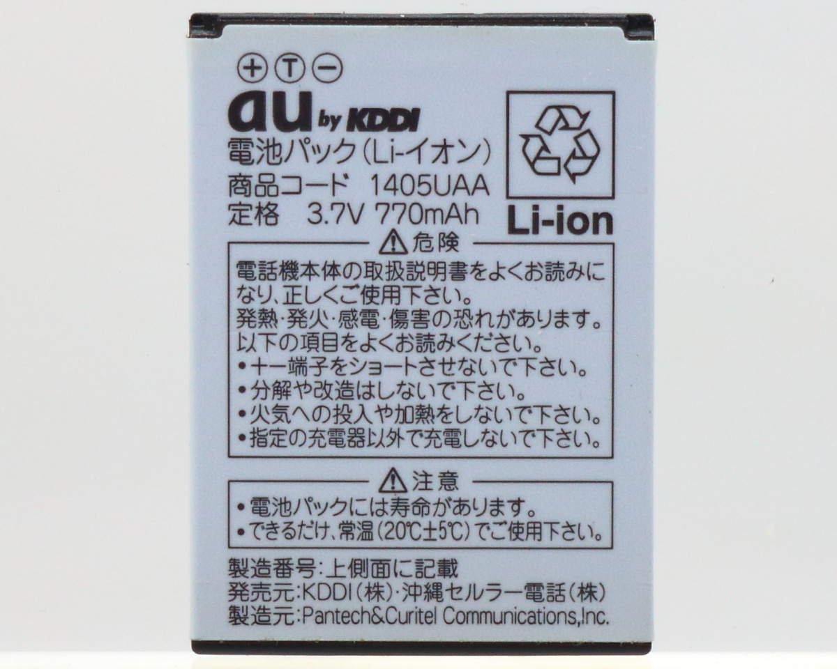 | au 純正電池パック 1405UAA / PANTECH A1405PT用 / 3.7V 770mAh / 中古品 / 充電・起動確認済 | |